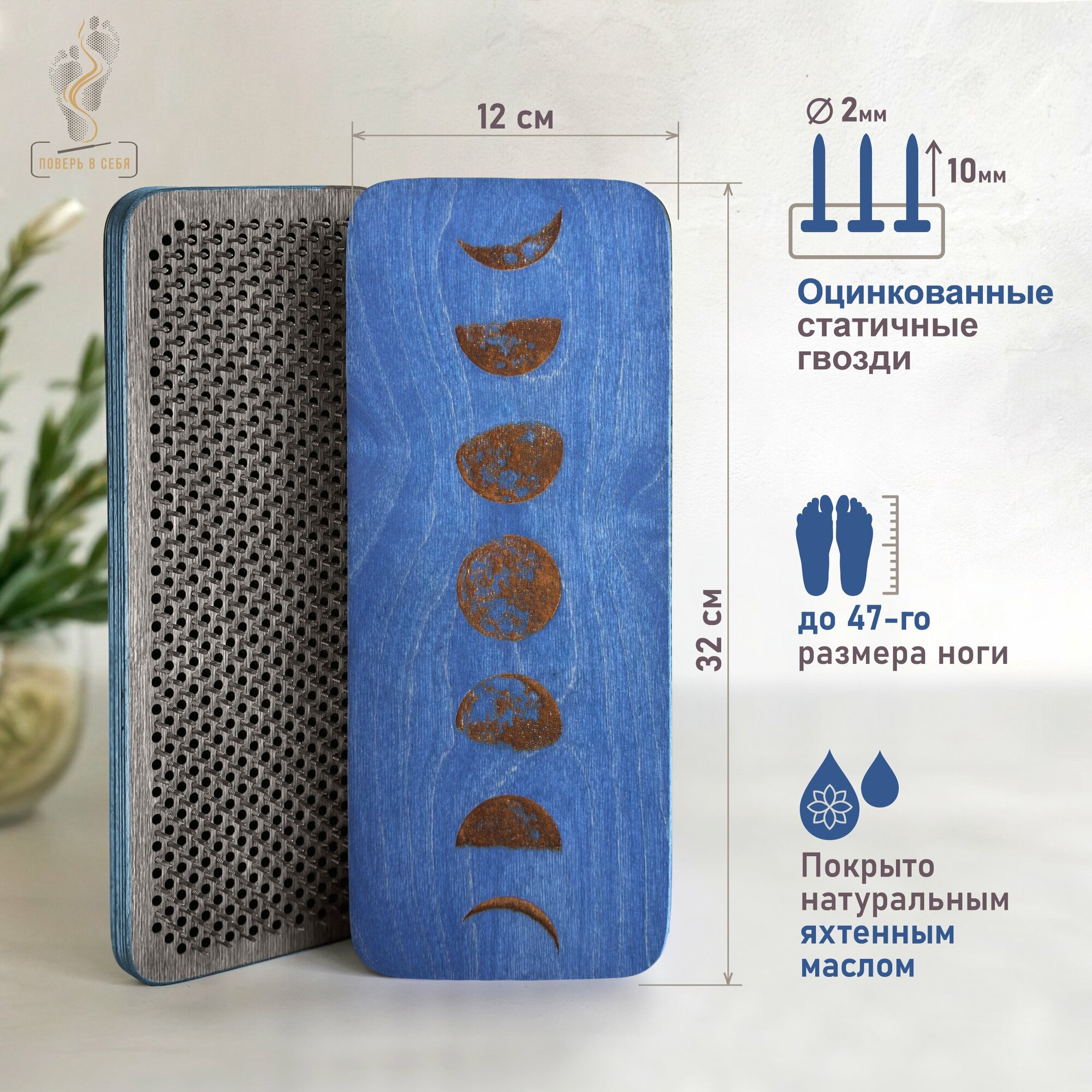 Доска Садху / Доска с гвоздями / Доска для йоги / Луна / Синий / шаг 8 мм информация: