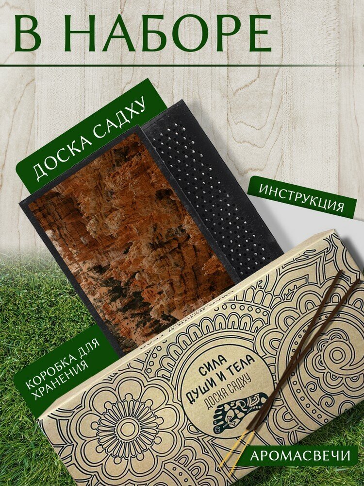 Доска Садху / Доска с гвоздями / Доска для Йоги / растения надпись - 1395, черная
