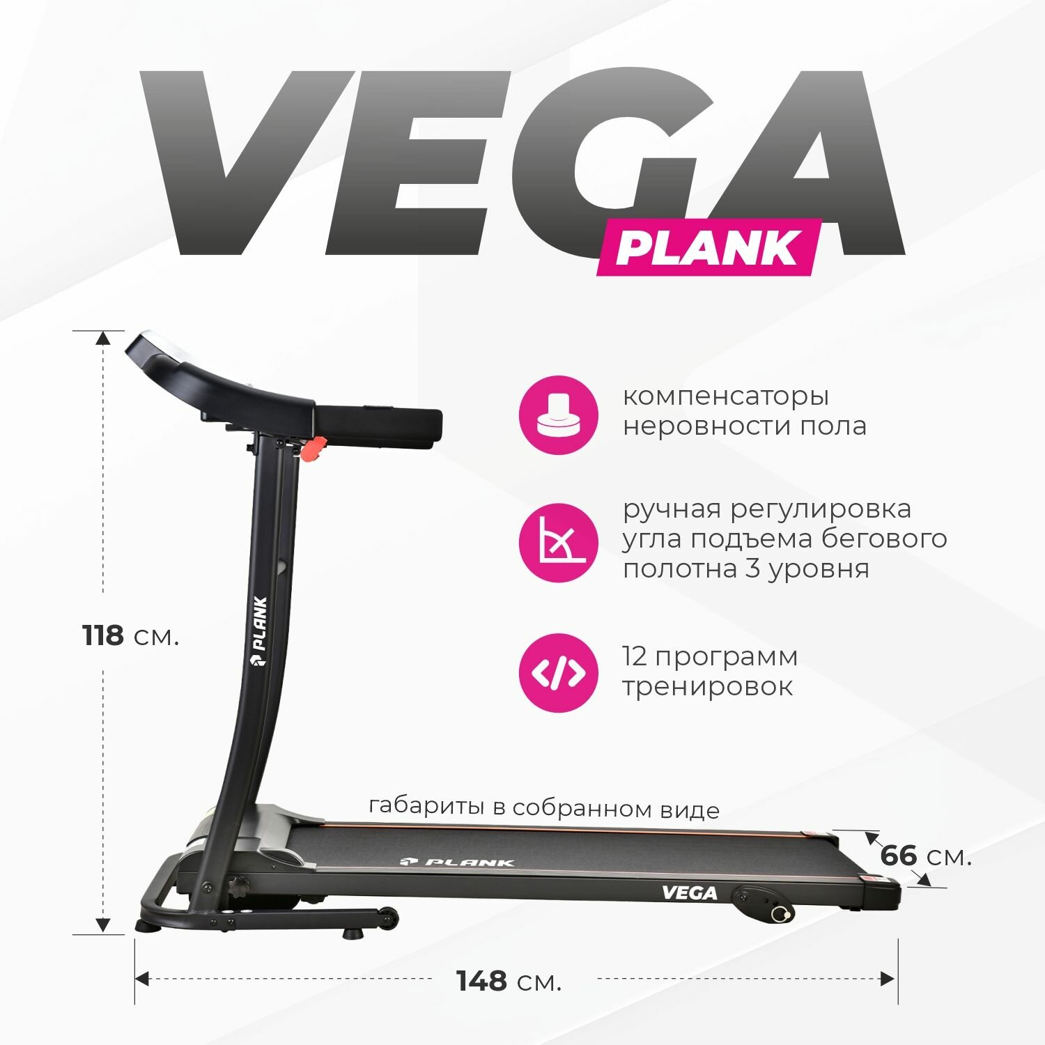 Беговая дорожка PLANK "VEGA", электрическая, противоскользящее полотно, 12 тренировочных программ информация: