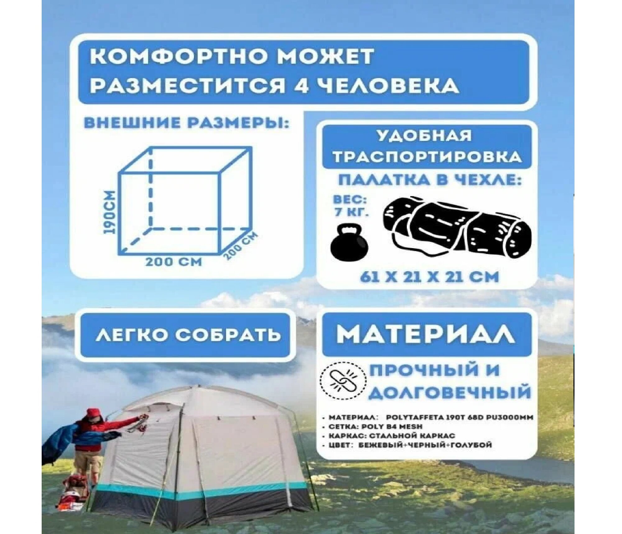 Палатка туристическая 4-х местная / Размеры: Д355*Ш235*В145 165см