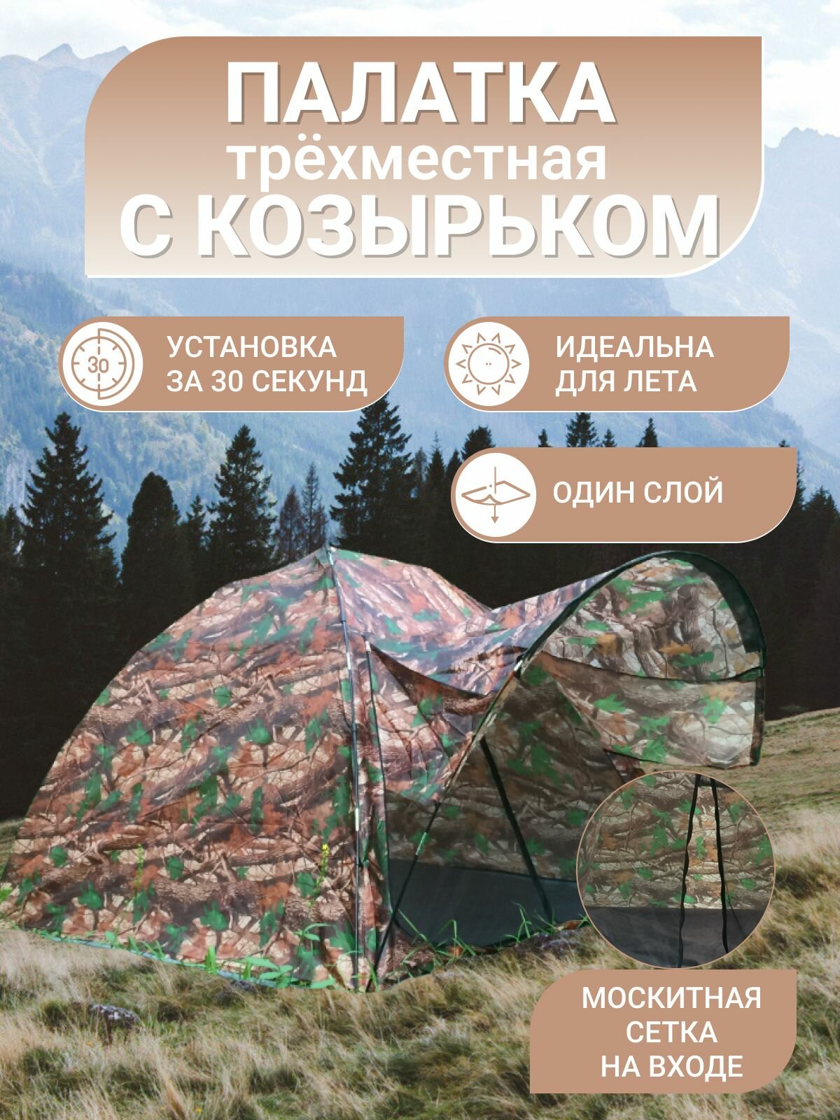Палатка CAMPPLANET, 3-местная, однослойная, с козырьком, для рыбалки информация: