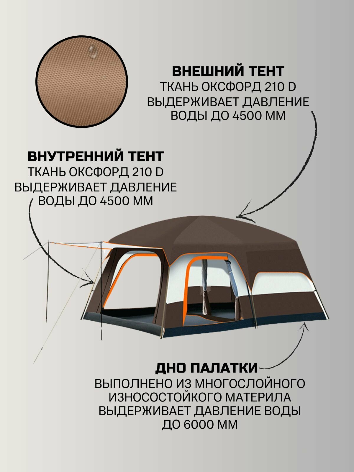 Характиристики этого товара не найдены!Отзывы на Палатка туристическая большая с тамбуром, 5-8 мест, 2 комнаты, Коричневый