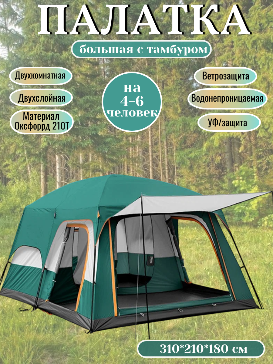 Характиристики этого товара не найдены!Отзывы на Туристическая двухкомнатная палатка с большим тамбуром и полом 310х210х180см, зеленая