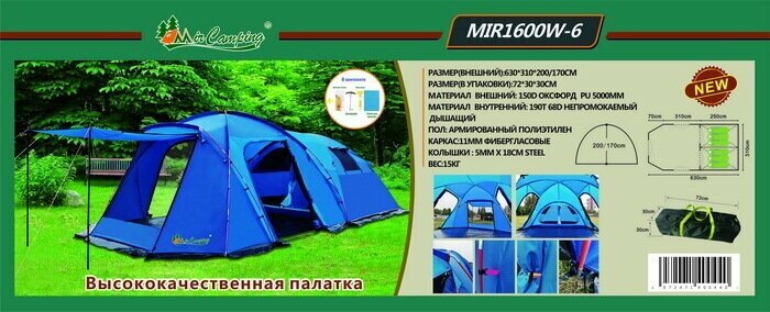 10 цен на Туристическая палатка MirCamping 1600W-6, на 6 мест, с полом, трехсезонная, синяя
