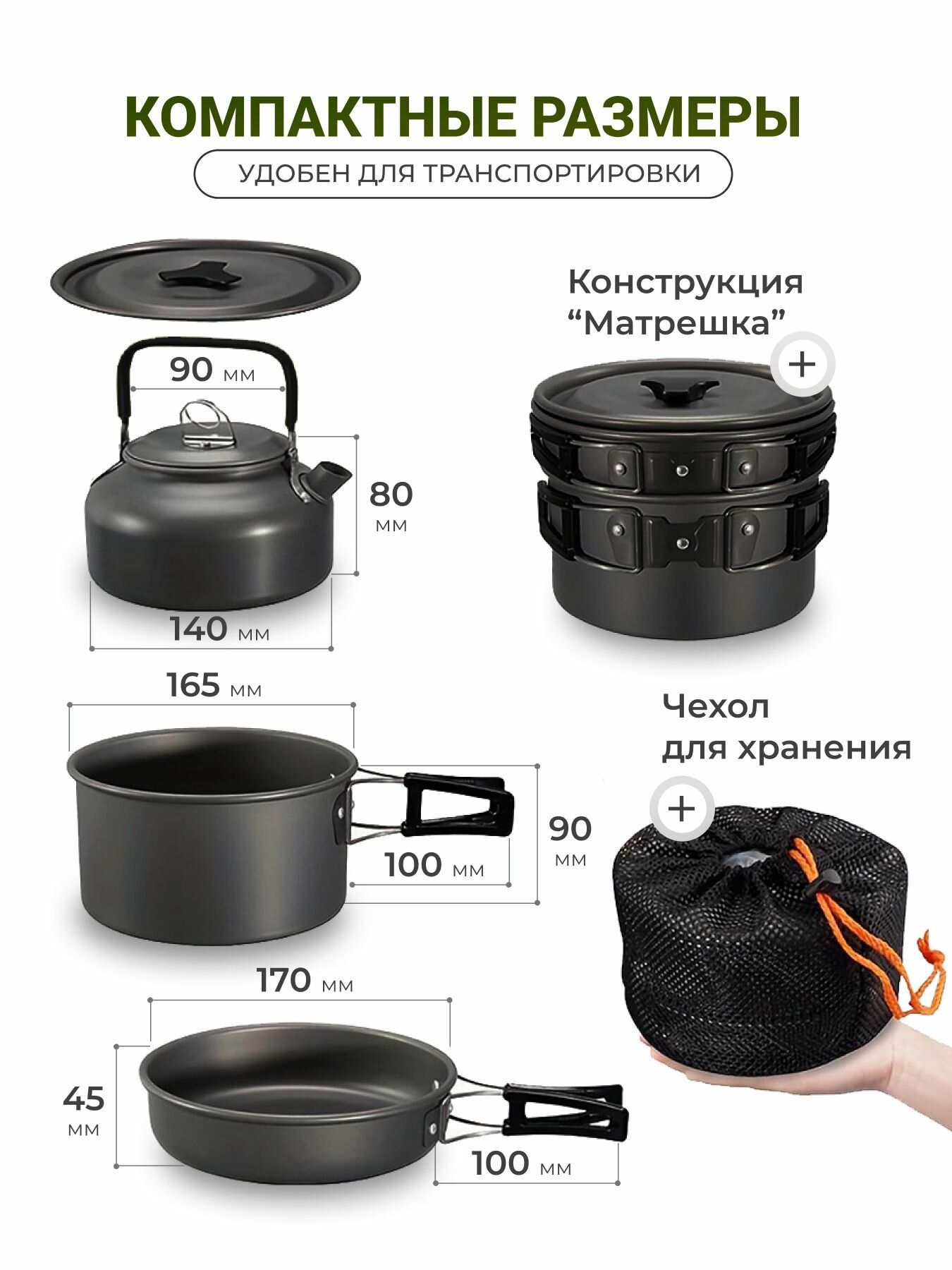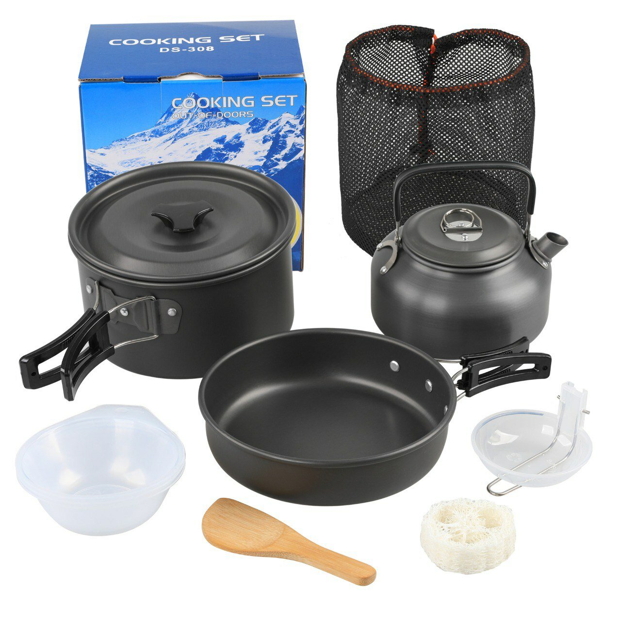 10 цен на Набор туристической посуды на 2-3 персоны - кастрюля, сковорода, чайник, миски, половник, лопатка, губка, чехол