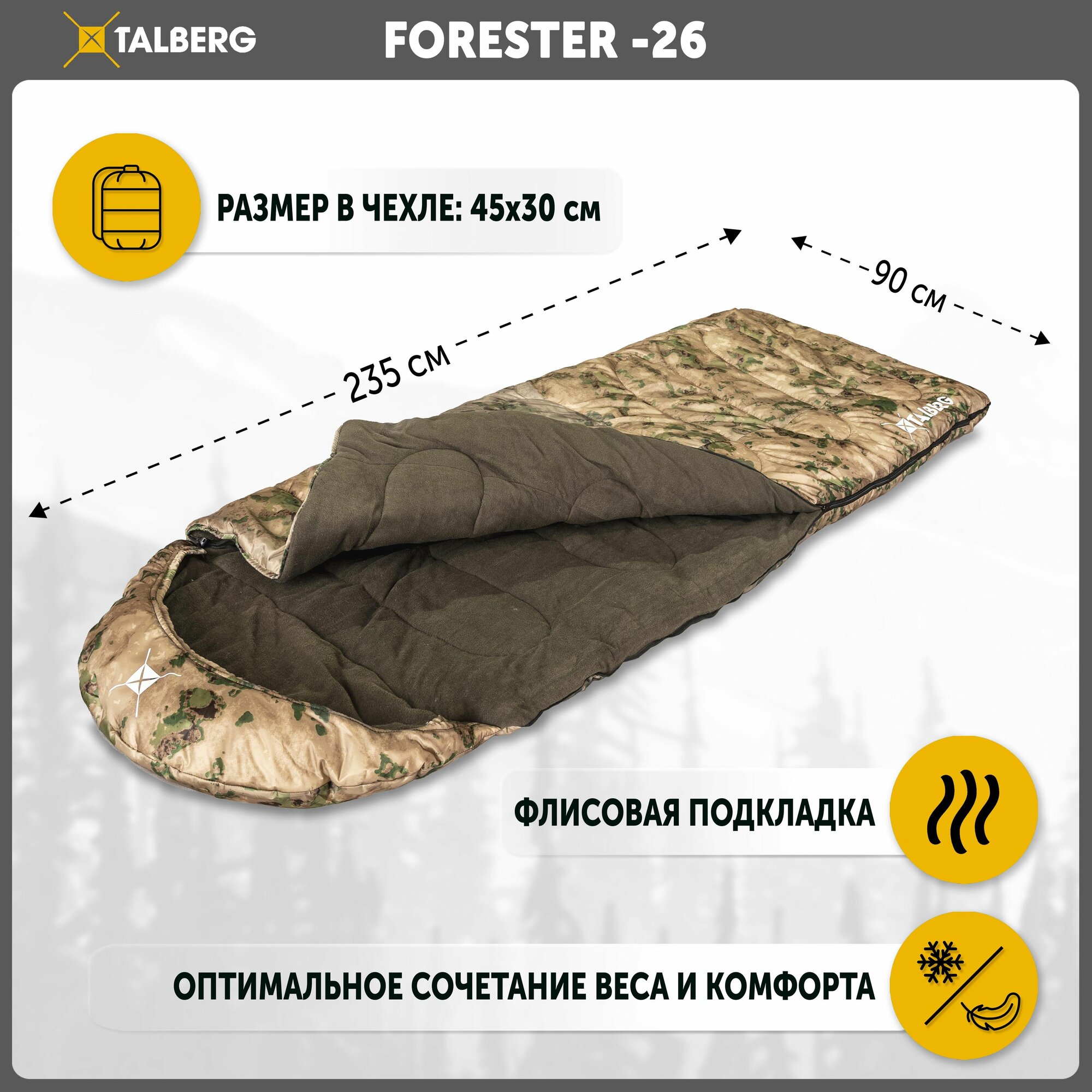 Спальный мешок туристический зимний Talberg FORESTER -26 С, туман, правая молния информация: