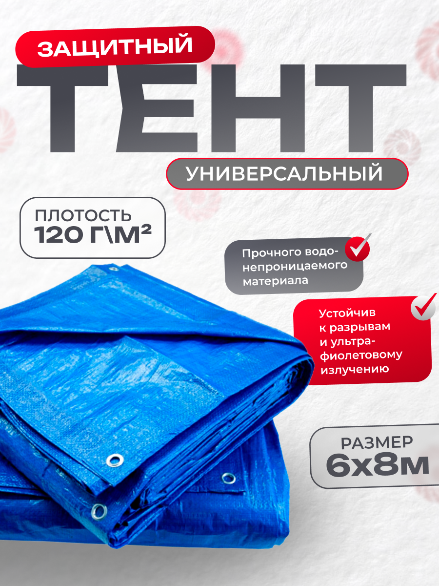 Тент укрывной усиленный с люверсами 6х8 м, 120г/м2, универсальный, туристический информация: