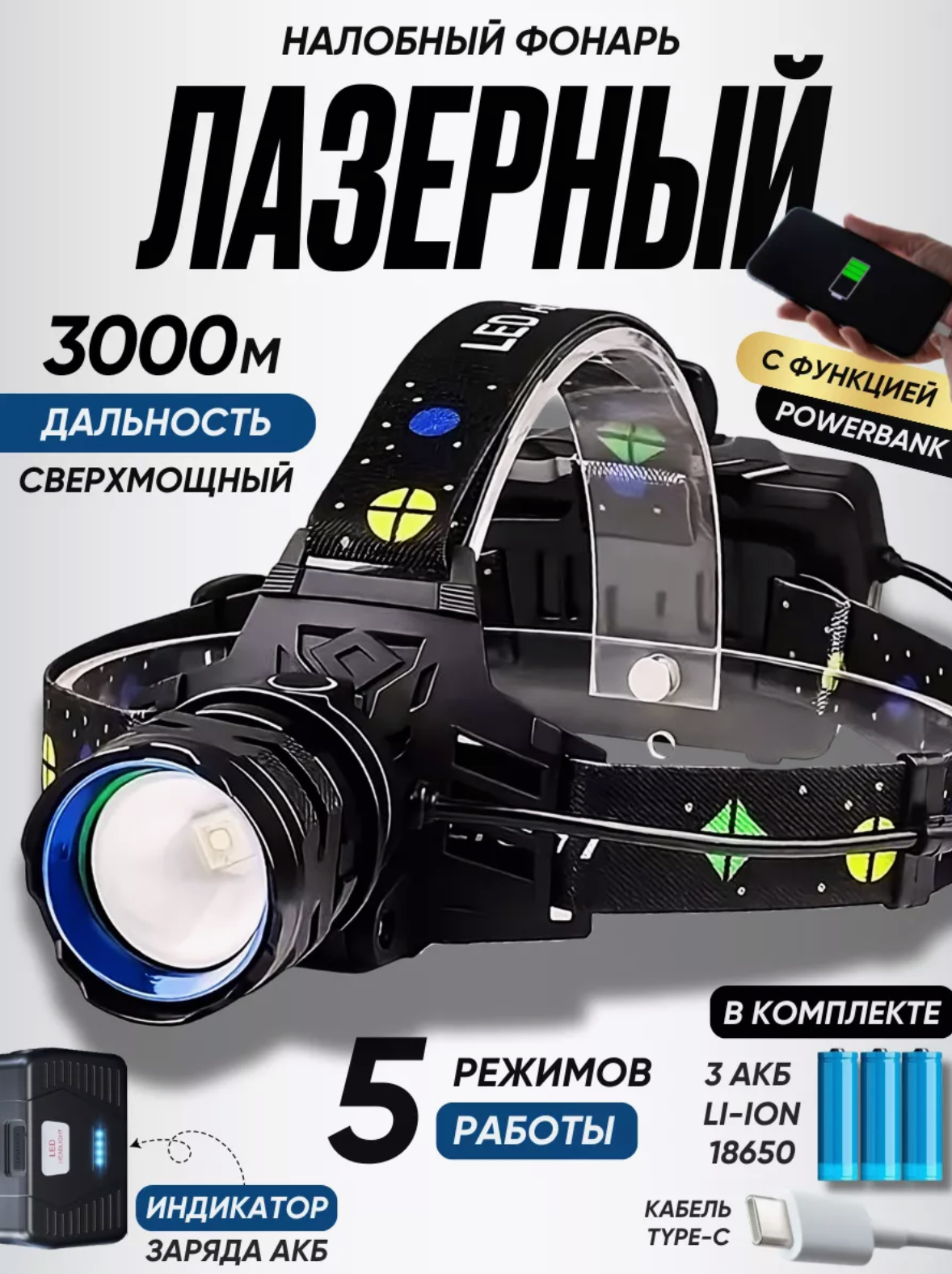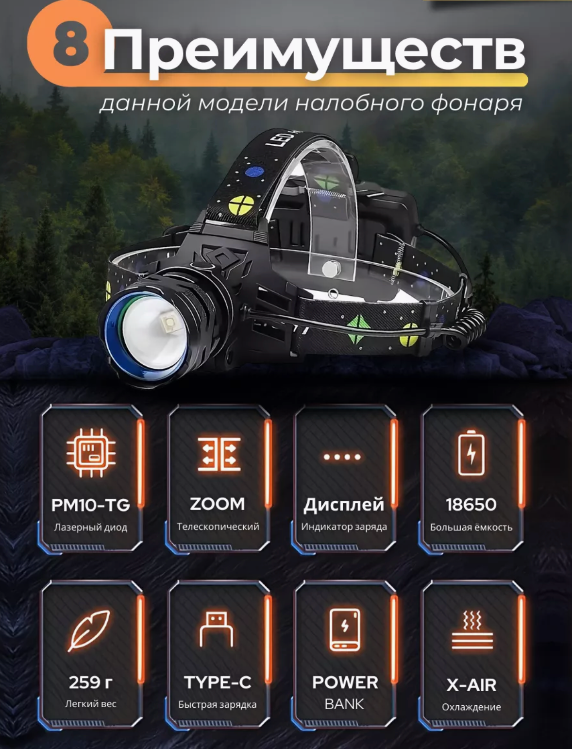 Отзывы на Фонарь налобный аккумуляторный светодиод PM-10TG, Power Bank, с функцией zoom