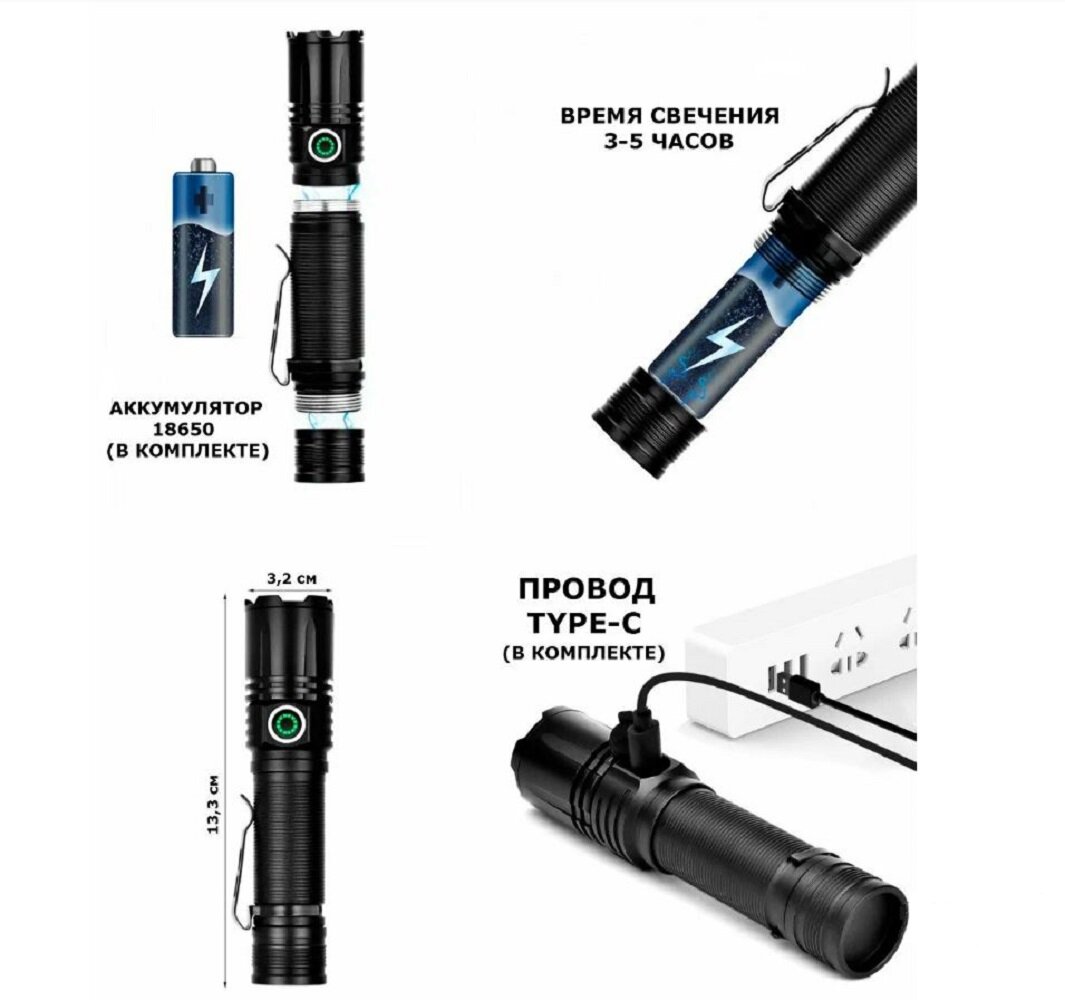 Фонарь ручной 372 TG, светодиодный, зарядка от USB, димер, на аккумуляторе 18650, вкл/выкл одним нажатием, легкий, малый информация:
