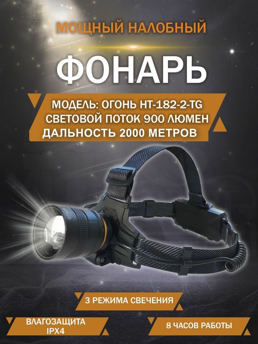 Мощный налобный водонепроницаемый, противоударный фонарь Огонь HT-182-2-TG, дальность 2000м с ZOOM информация:
