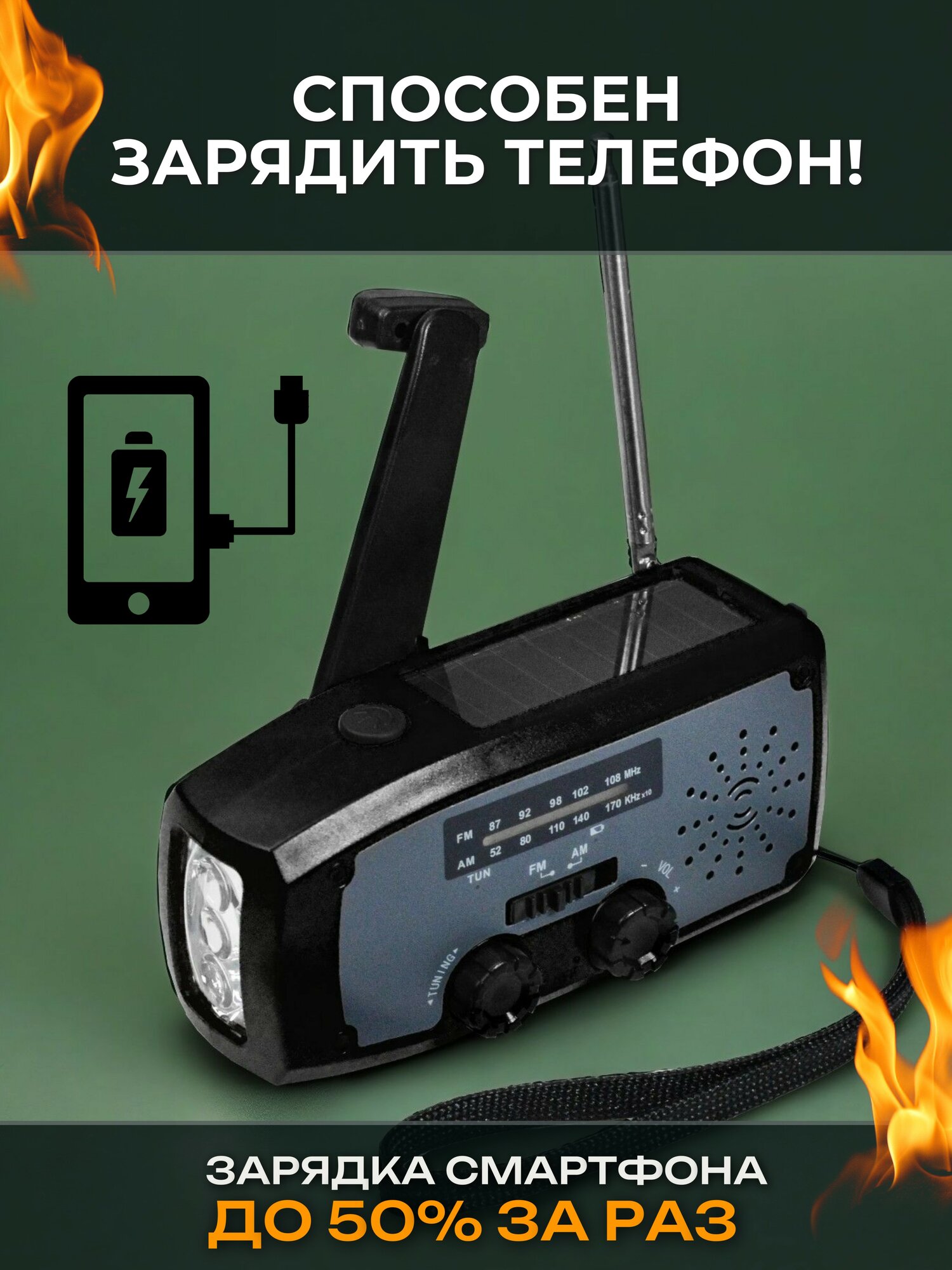 Аварийный динамо-фонарь с радио, сменным аккумулятором, USB для зарядки устройств, ручной генератор / Динамо машина-зарядное устройство, механическая зарядка информация:
