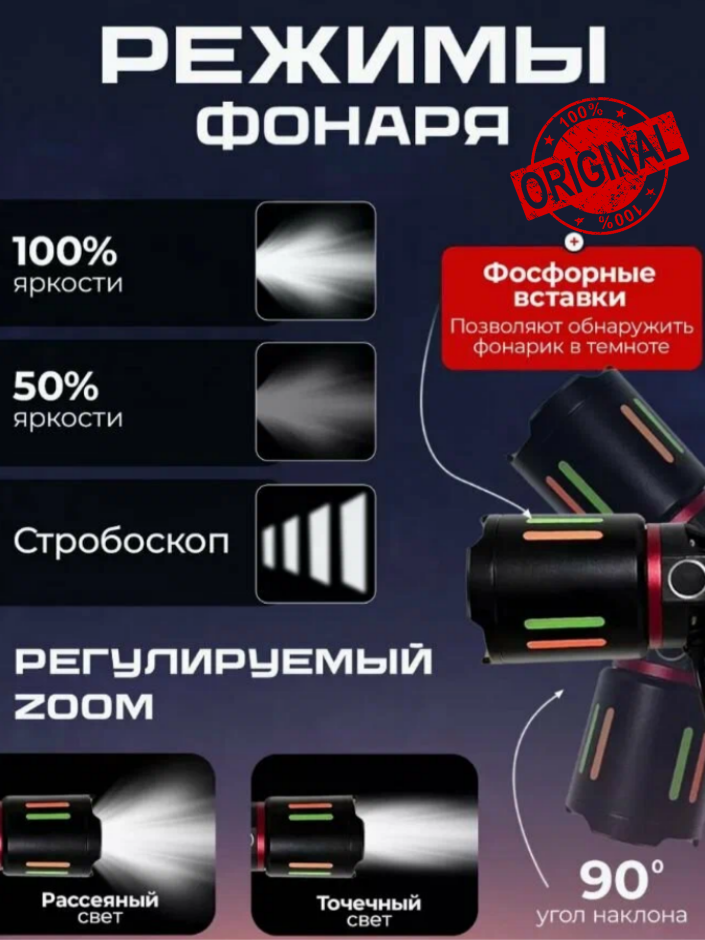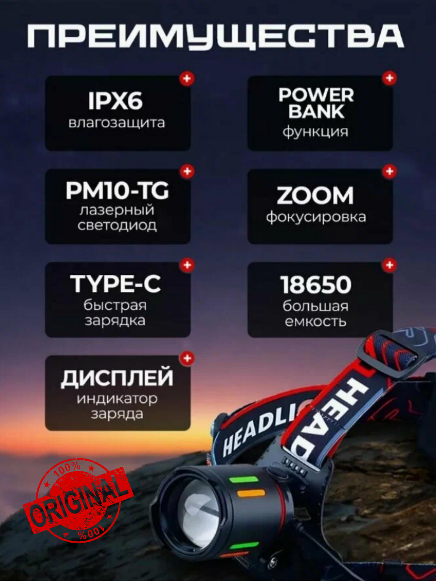 Отзывы на Налобный фонарь аккумуляторный PM10-TG, светодиодный, 7 режимов + PowerBank