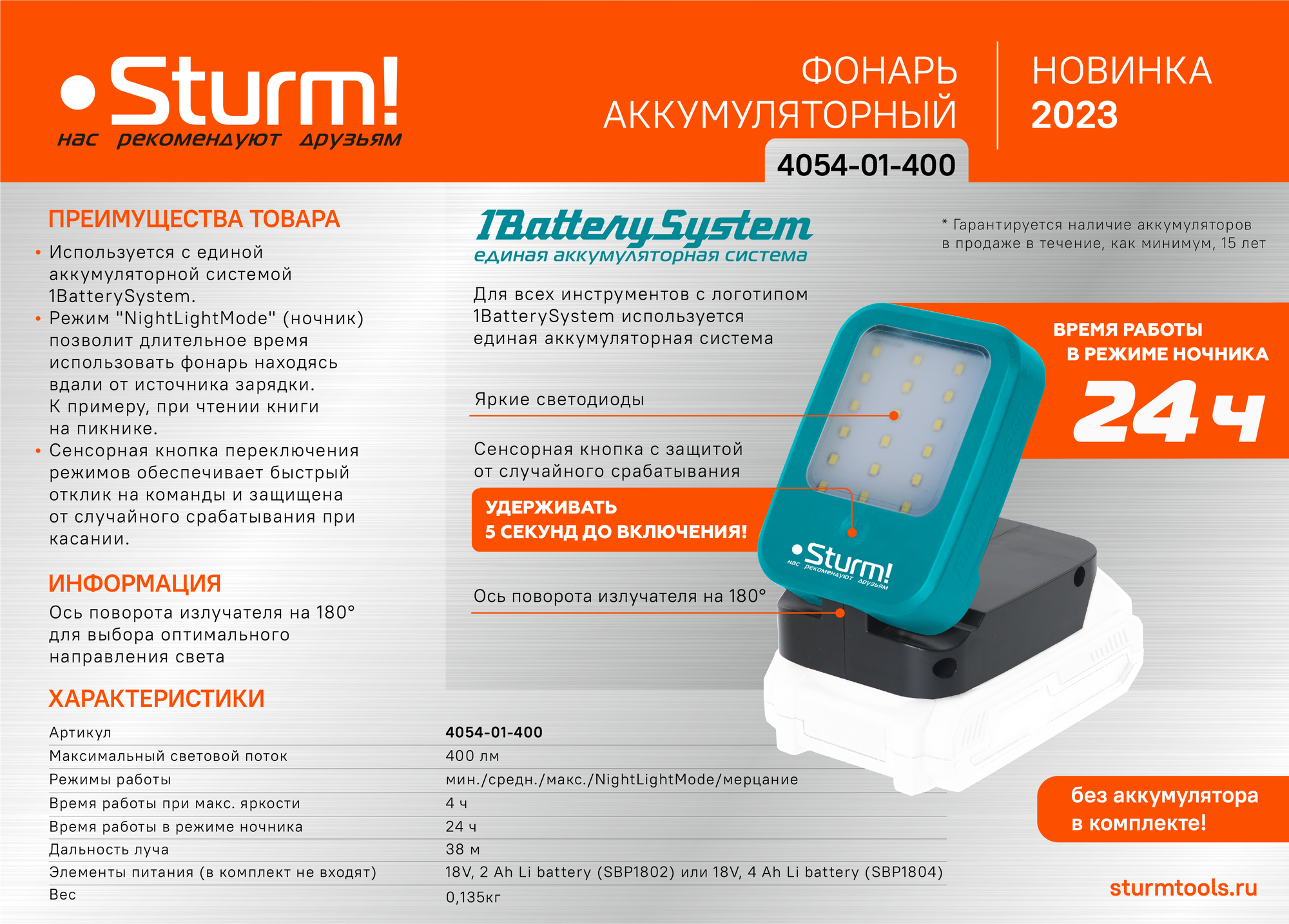 Фонарь-прожектор, 400лм, 5 режимов, 1BatterySystem, без АКБ И ЗУ, Sturm! информация: