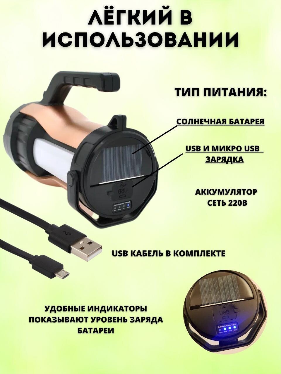 Фонарь светодиодный аккумуляторный ручной на солнечной батарее 7 режимов работы c функцией Power bank T96 информация: