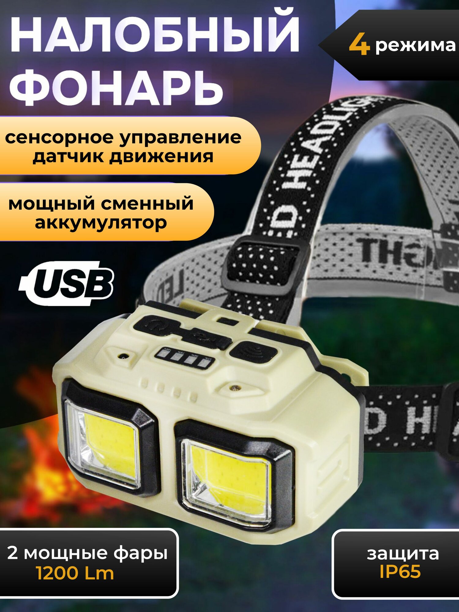 Налобный фонарь с сенсорным управлением, датчиком движения, 2 диодами, сверхмощным сменным аккумулятором, 4 режима информация: