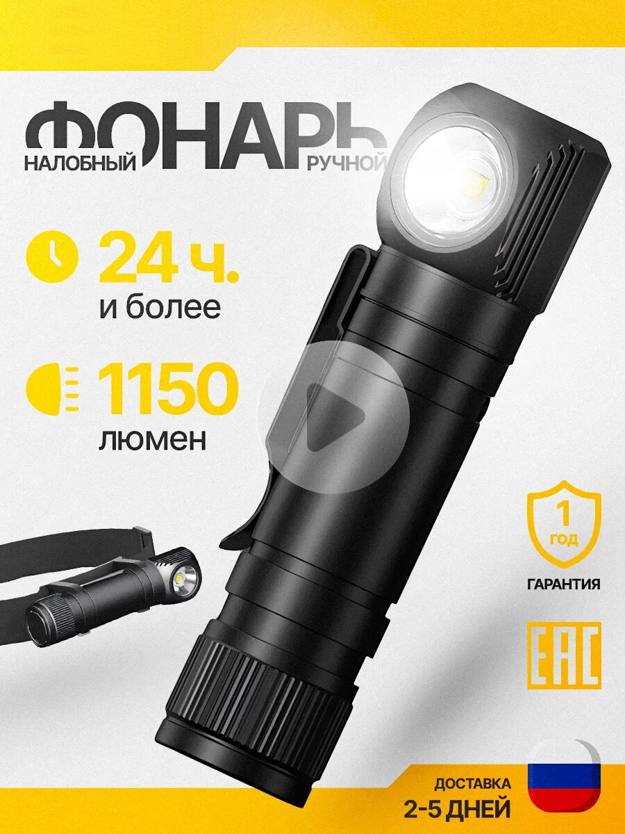 Налобный фонарь аккумуляторный, мощный светодиодный 18650