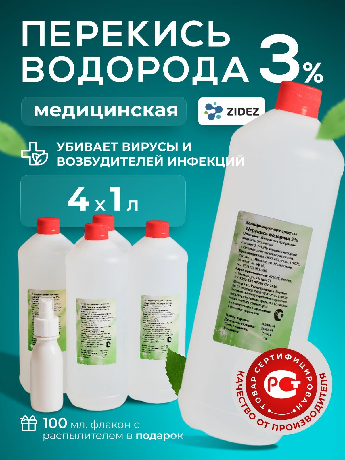10 цен на Перекись водорода 3% медицинская 4 шт. по 1 л + 100 мл. флакон с распылителем. Дезинфицирующее средство для бассейна.