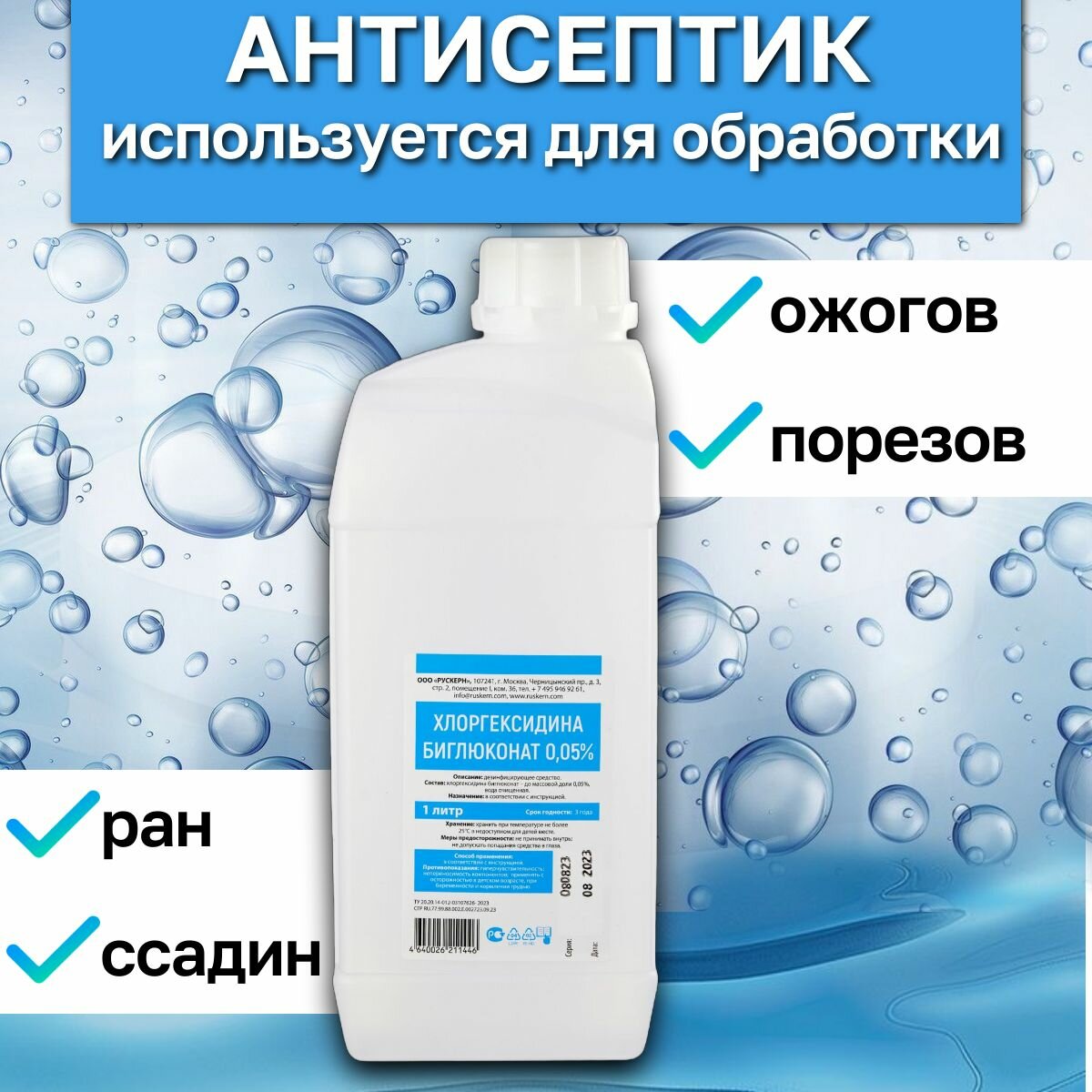 Хлоргексидин 0,05%, 1л, 8 шт. Антисептик и дезинфицирующее средства для рук и инструментов. 1 530 ₽