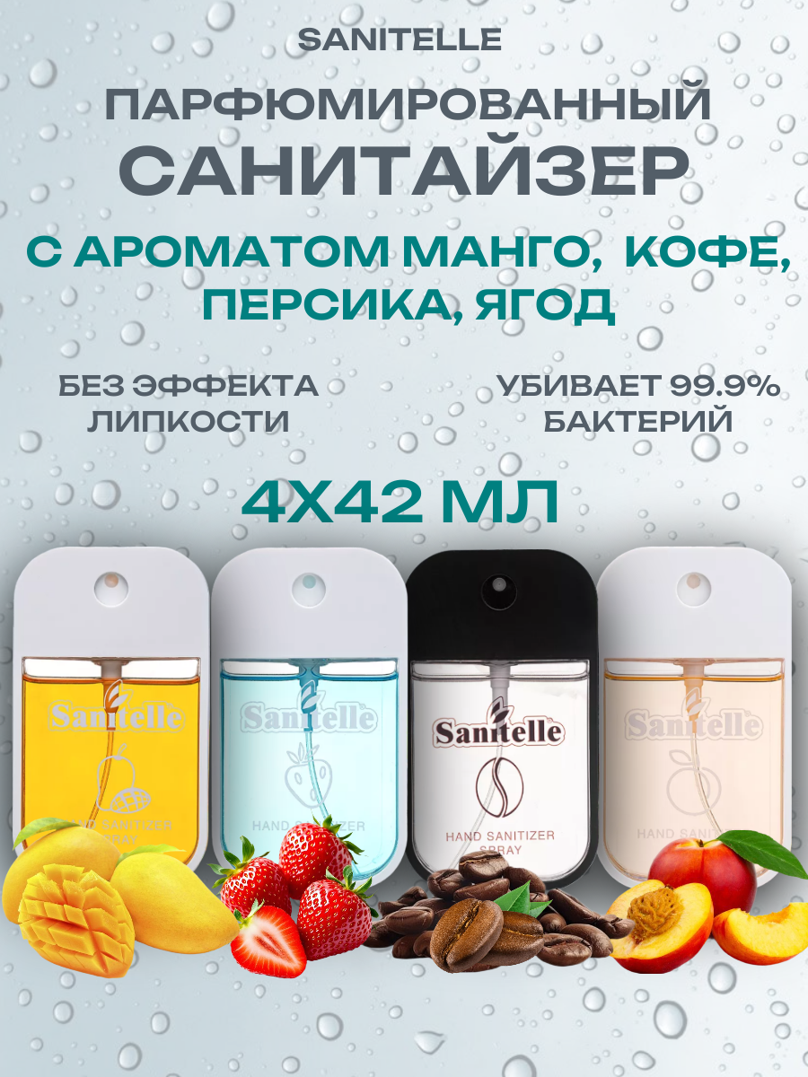 Санитайзер Sanitelle Парфюмированный, с ароматами кофе, персика, манго, ягод, 4x 42 мл информация: