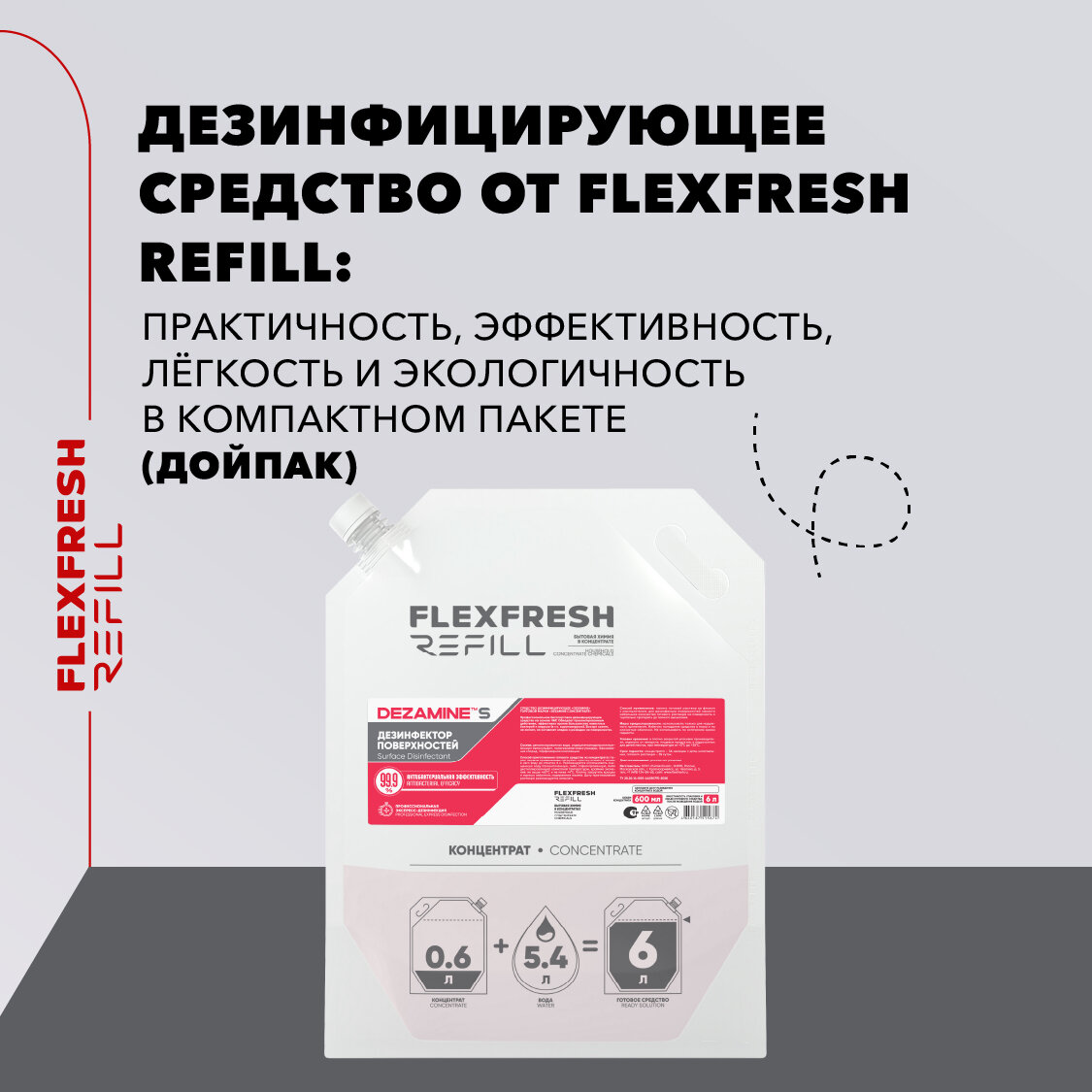 Антисептик для поверхностей без спирта Flexfresh Refill концентрат 600 мл = 6 л, флакон в комплекте информация: