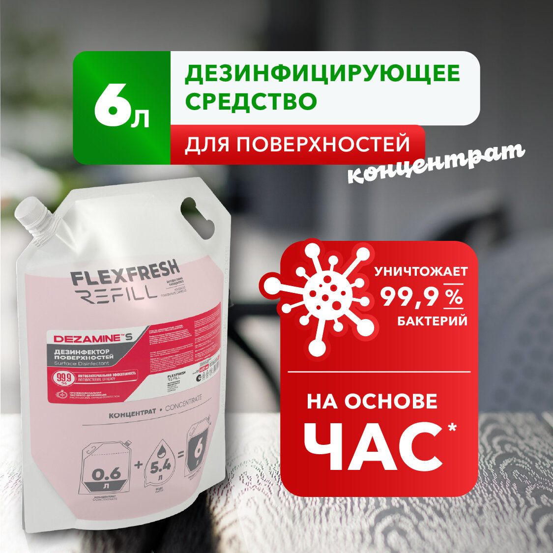 Антисептик для поверхностей без спирта Flexfresh Refill концентрат 600 мл = 6 л информация: