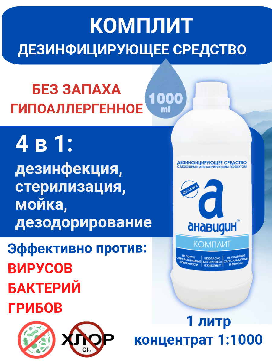 10 цен на Анавидин Комплит гипоаллергенное, без запаха, дезинфицирующее средство, 1 л, концентрат 1:1000
