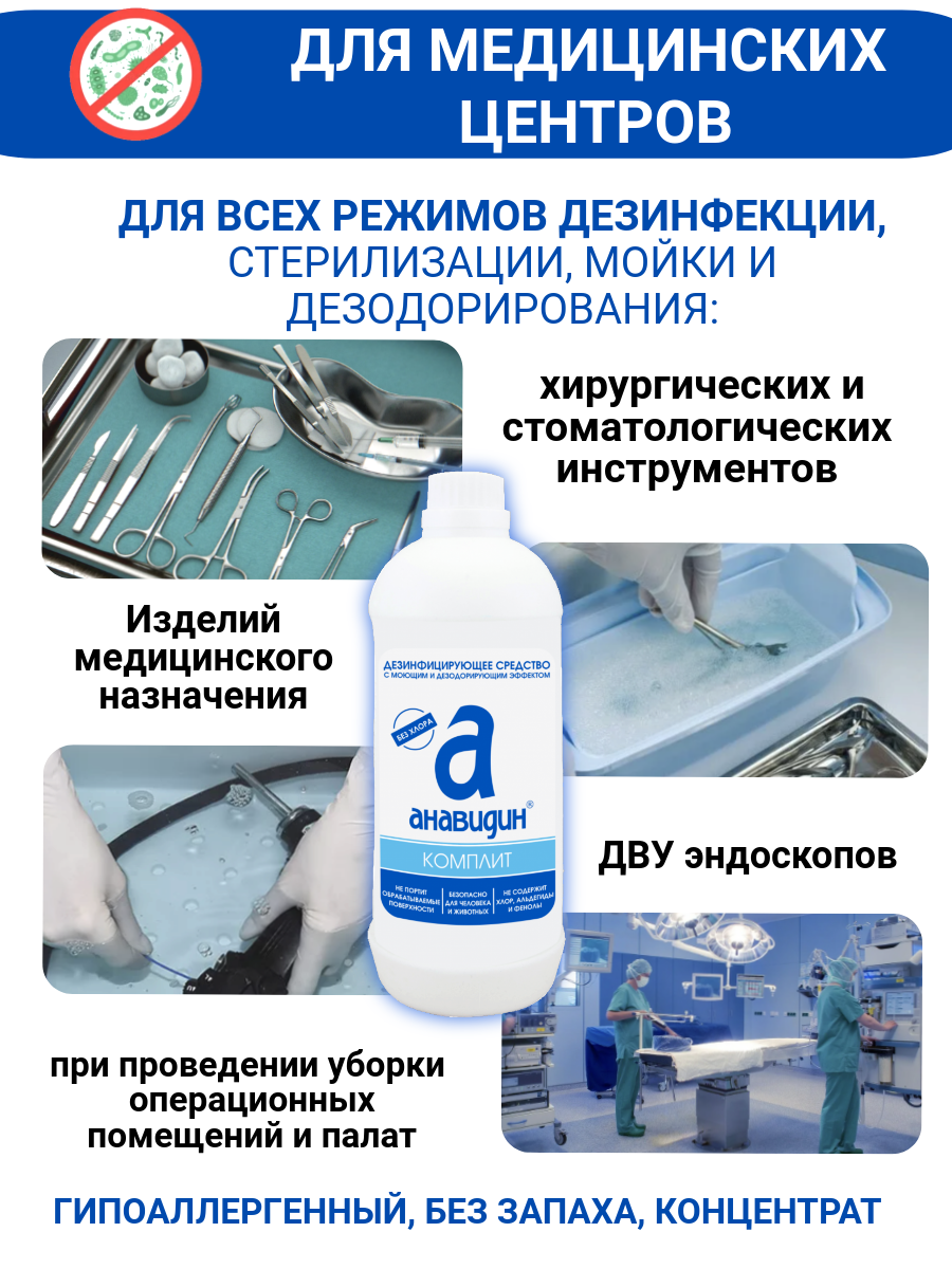 Отзывы на Анавидин Комплит гипоаллергенное, без запаха, дезинфицирующее средство, 1 л, концентрат 1:1000