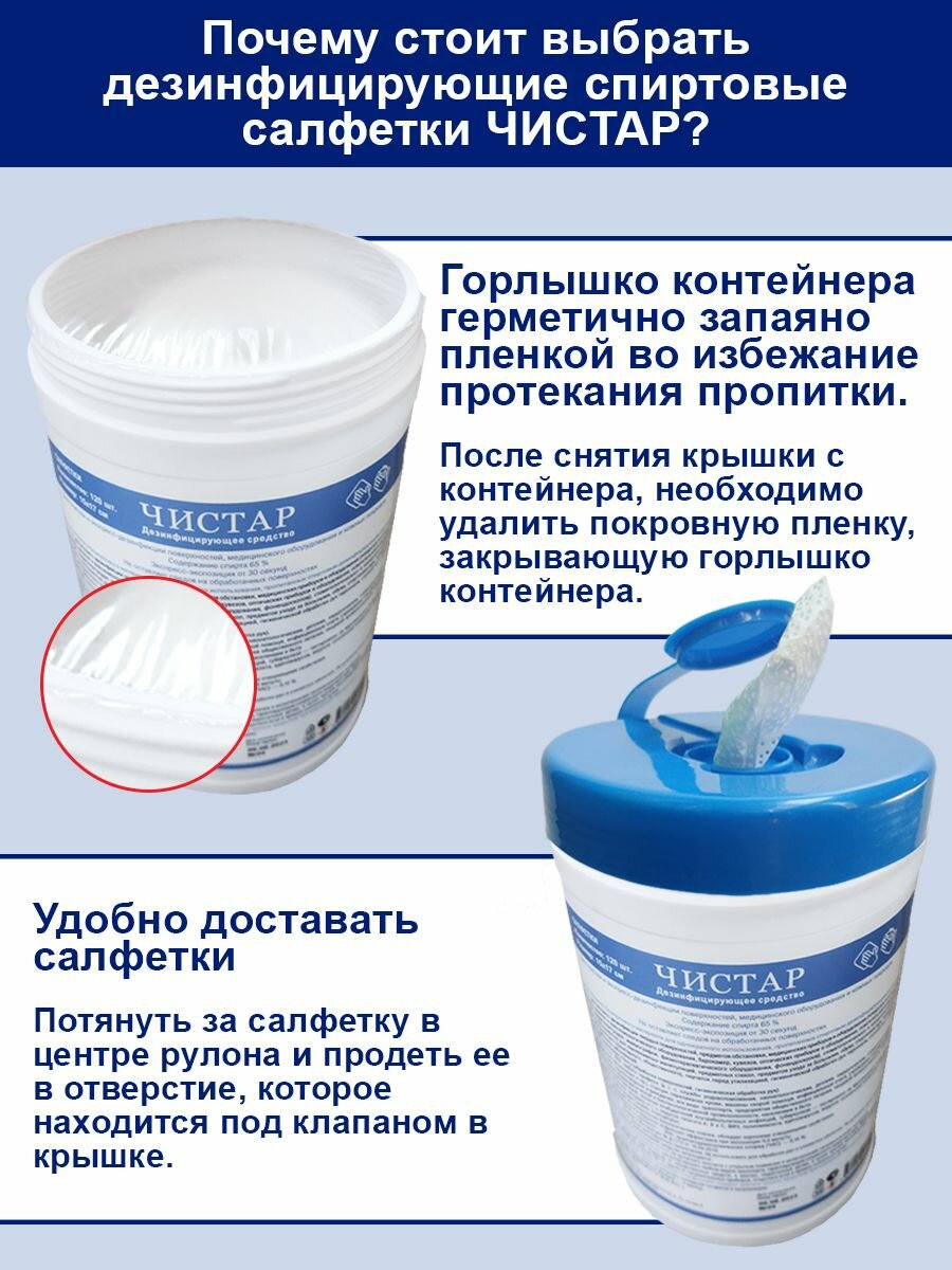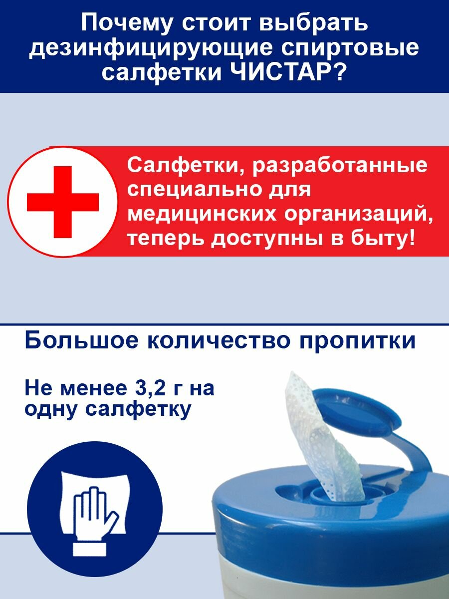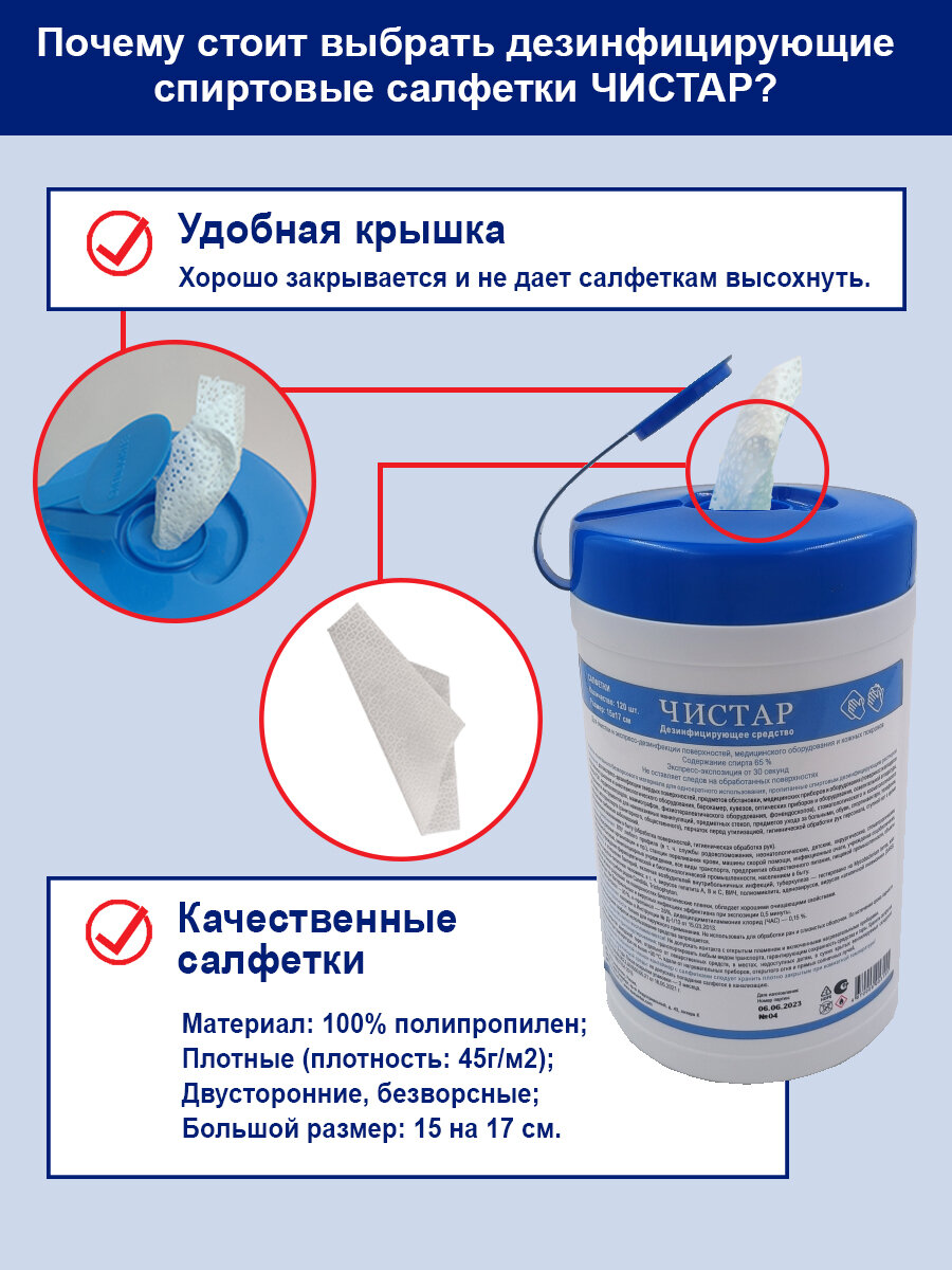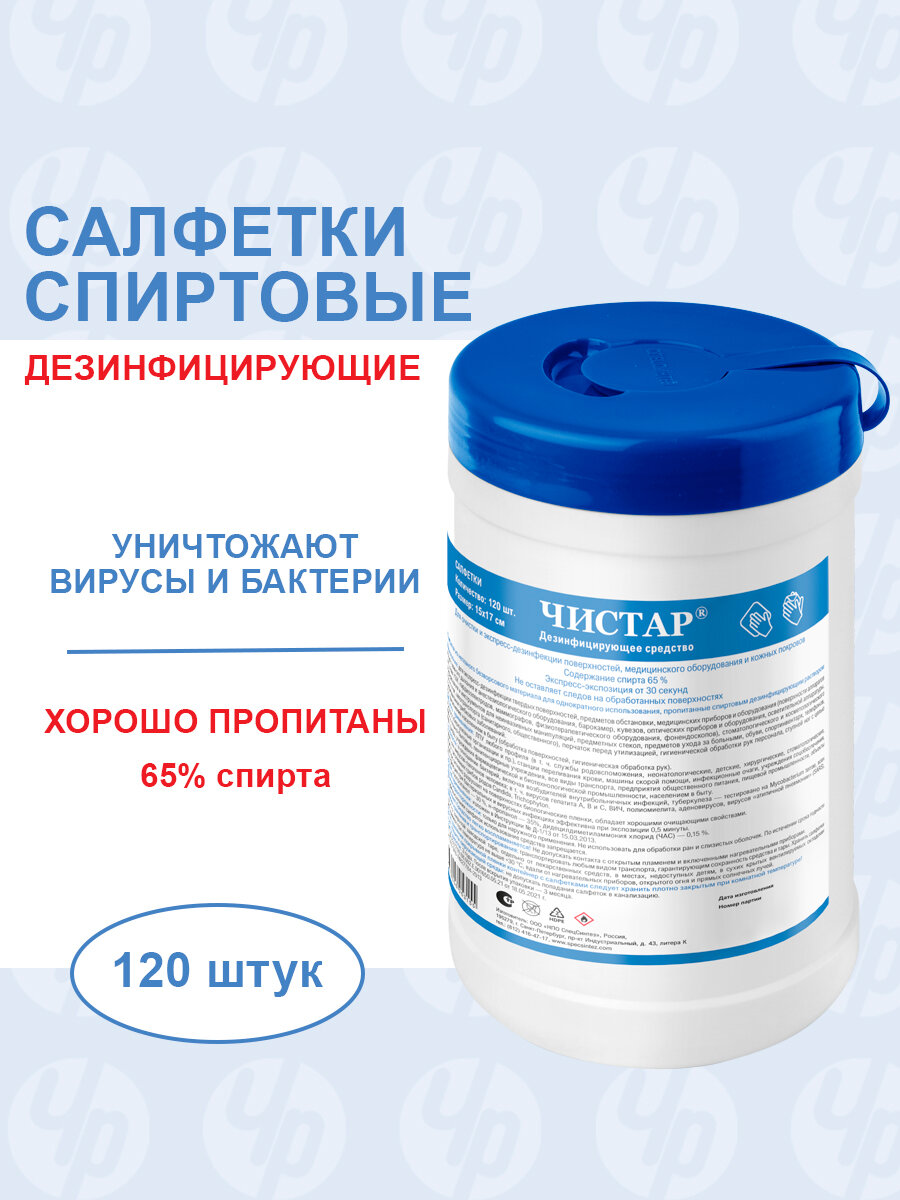 Салфетки дезинфицирующие спиртовые безворсные 120 штук, Чистар информация: