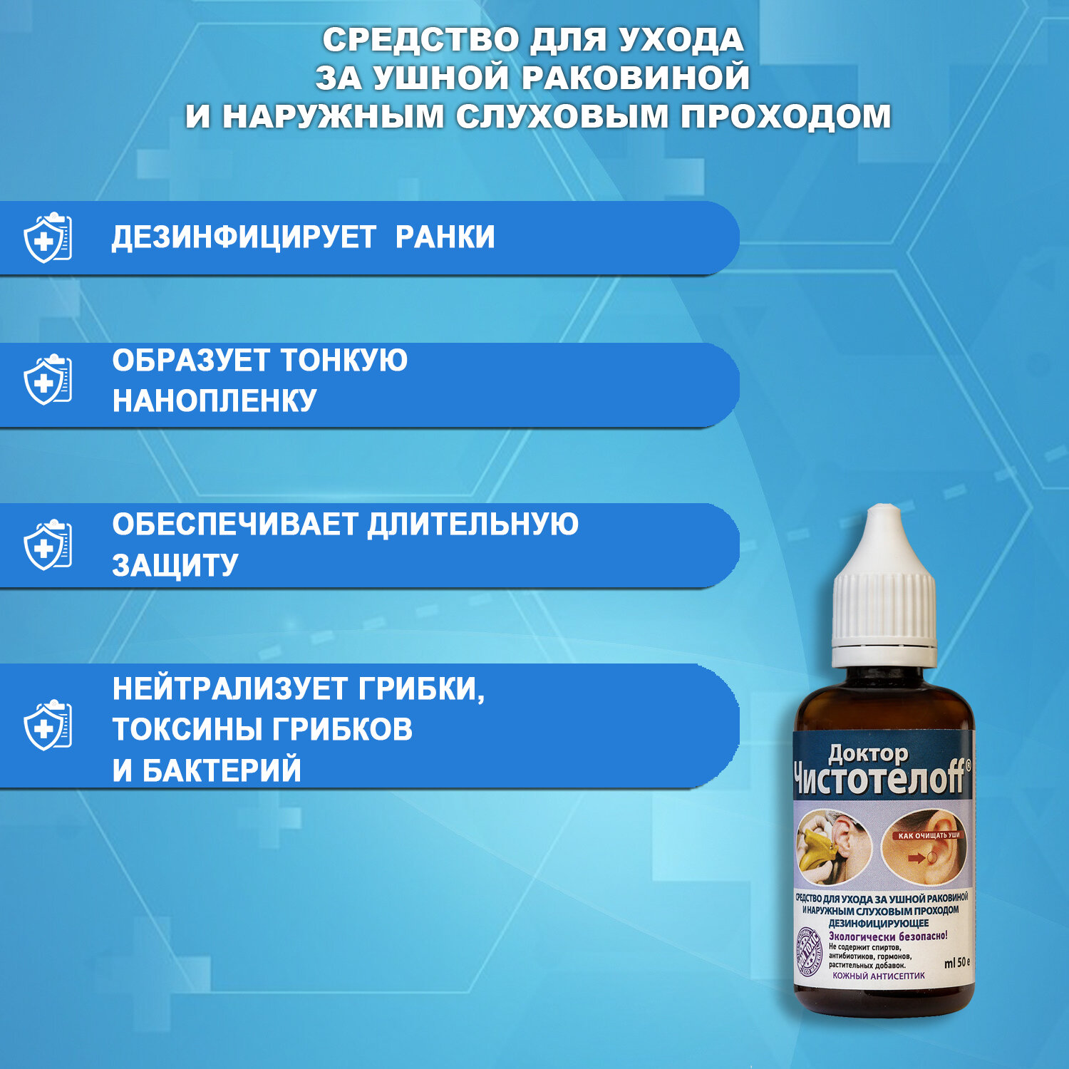 Дезинфицирующее средство для ухода за ушной раковиной и наружным слуховым проходом Доктор Чистотелоff, капли 50 мл информация: