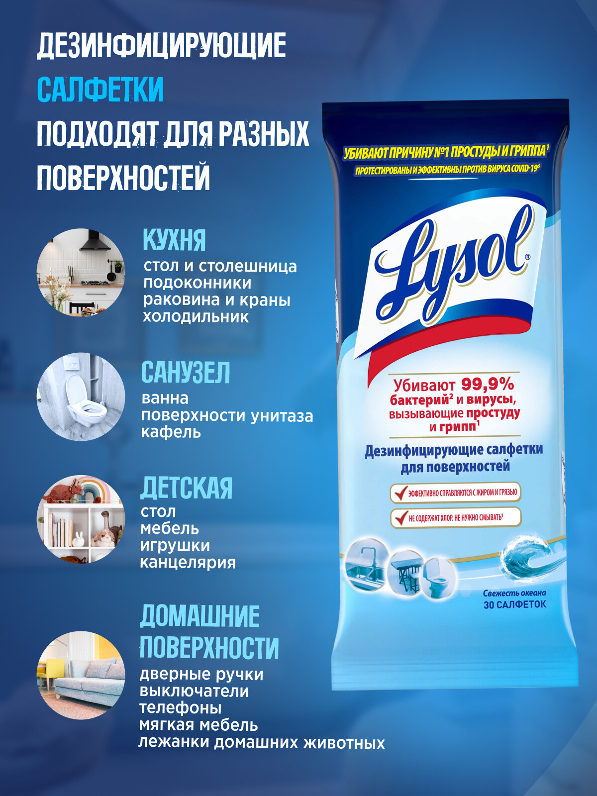 Влажные дезинфицирующие салфетки Lysol "Свежесть океана" 30шт, 2 упак. информация: