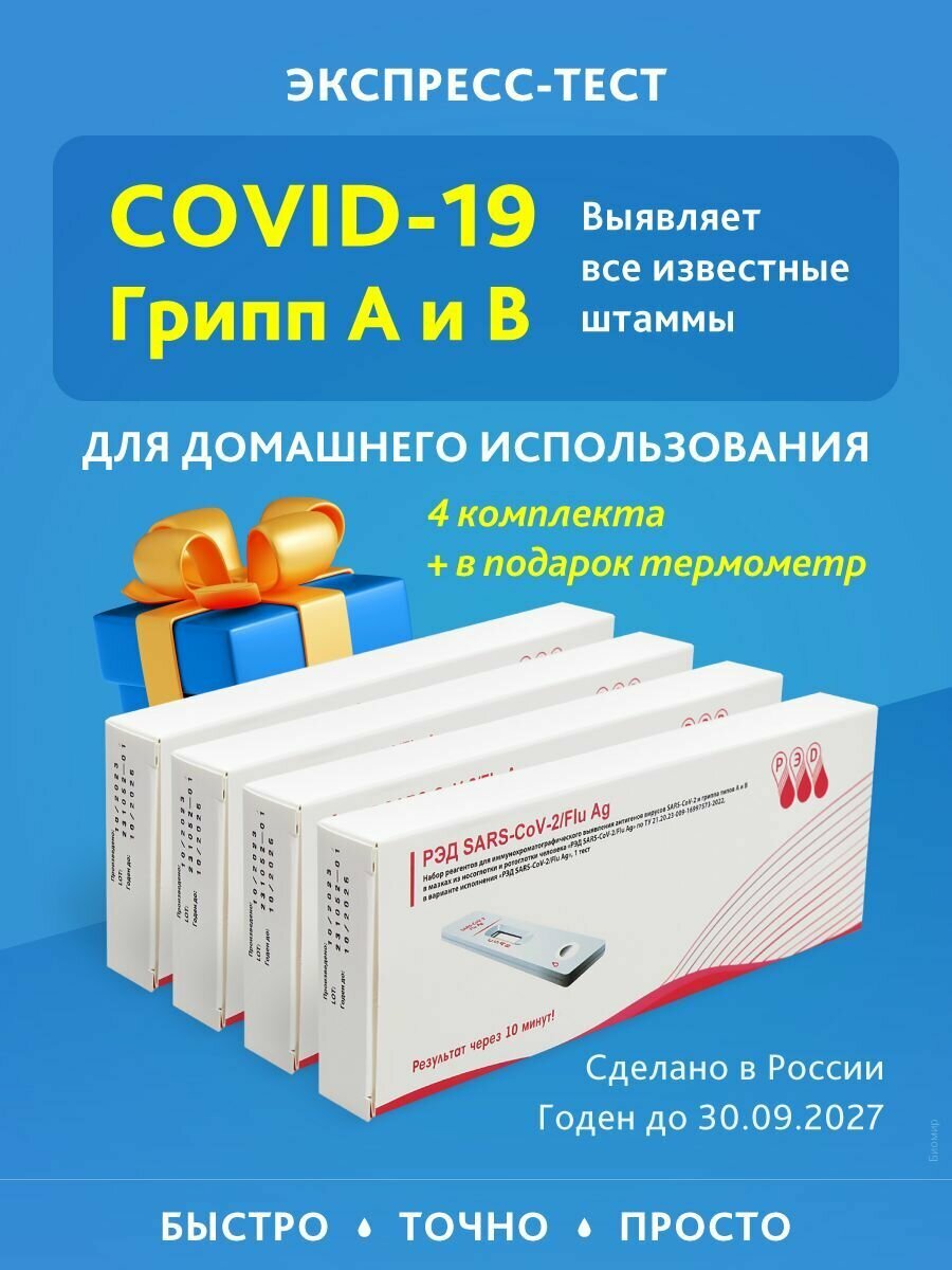 10 цен на Экспресс тест на ковид и грипп А и В , ковид 19 , ПЦР на три вируса сразу 4 шт.