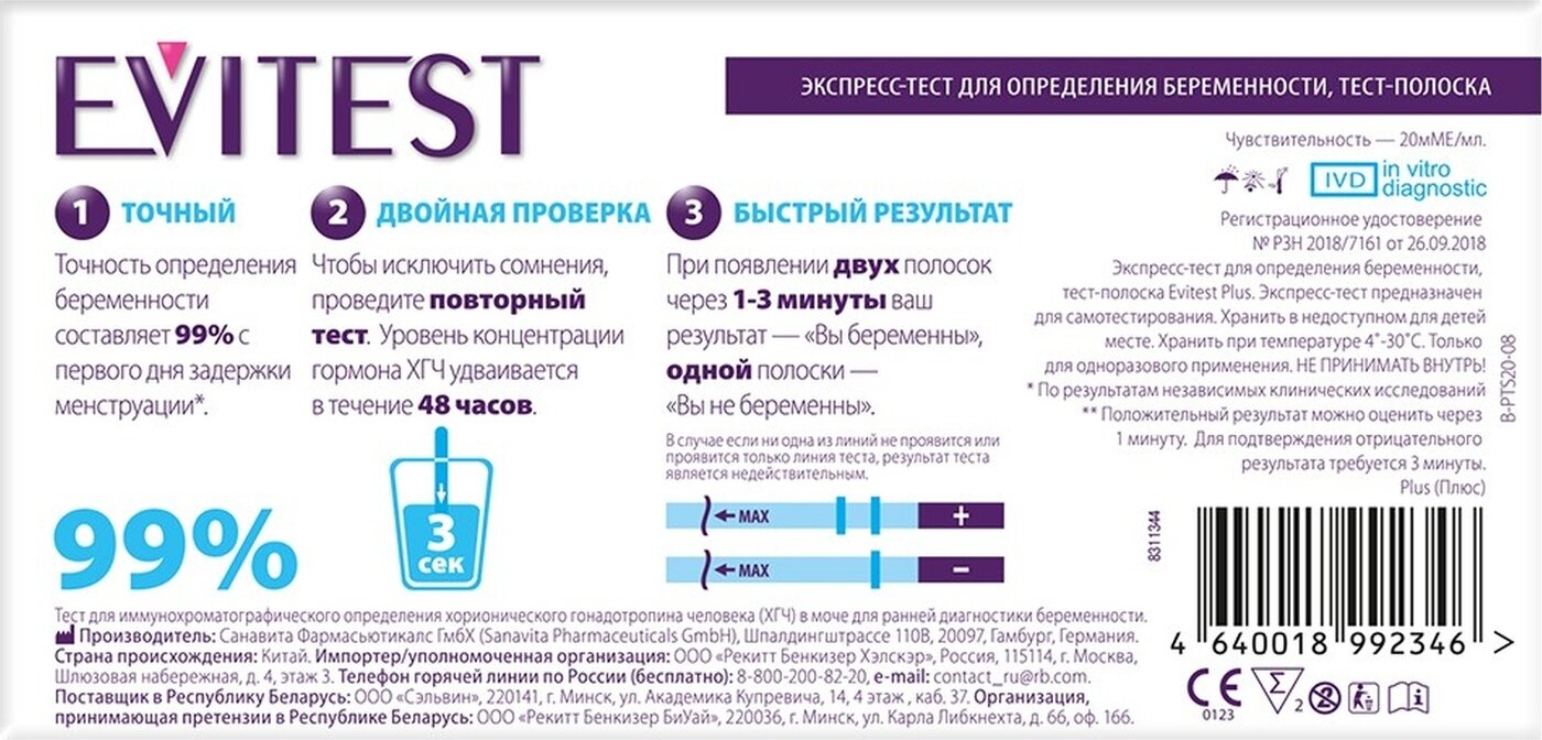 Evitest Тест "Plus" для определения беременности, 3 упаковки по 2 шт, комплект из 3х упаковок информация: