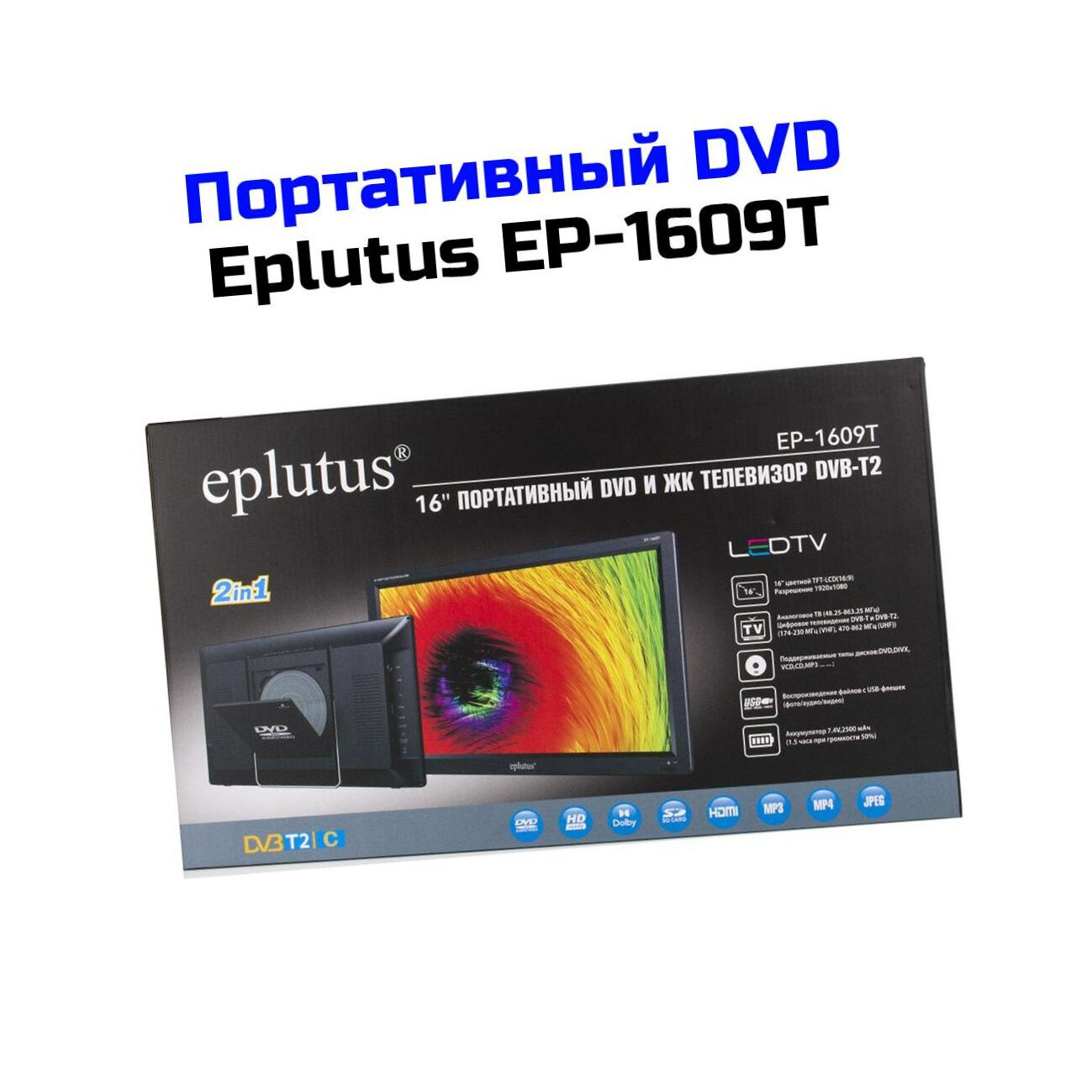 Портативный DVD с цифровым тюнером DVB-T2 16" и записью на USB-носитель Eplutus 1609Т (TFT) (M60965PO), мобильный DVD плеер. Экран 1920x1080, А информация: