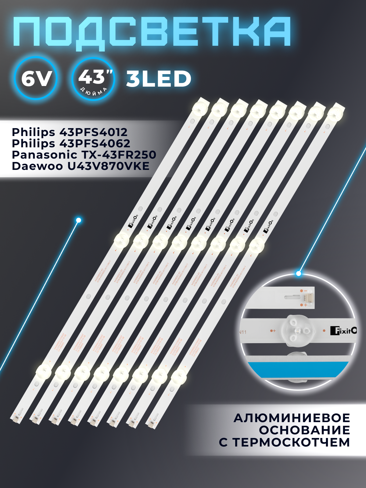 10 цен на Подсветка для телевизора Philips 43PFS4012/12, AOC LE43M3570, K430WDK3, 43PFS4062 и др 43" 6V / 3 led / 8 шт 389mm