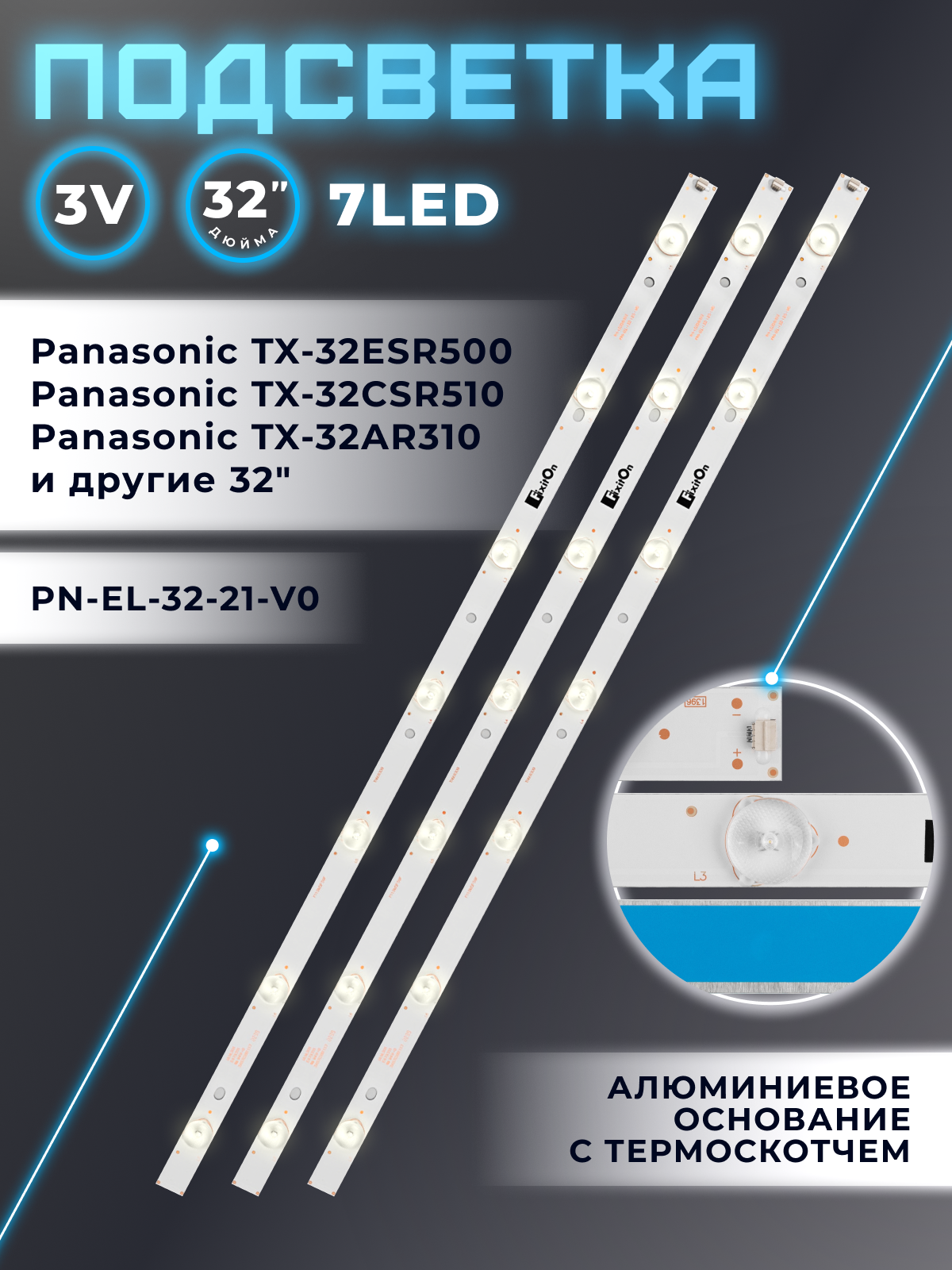 10 цен на Подсветка для телевизора Panasonic TX-32ESR500, TX-32AR310 и др / 32" 3V 7 led (комплект 3 шт) 612mm