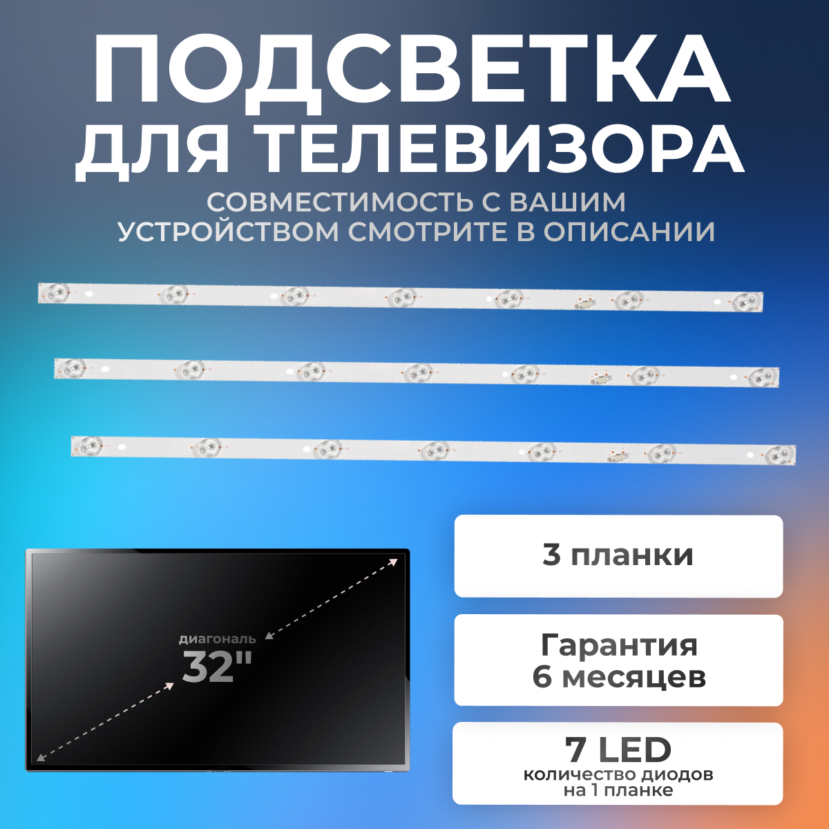 10 цен на Подсветка для MYSTERY MTV-3224LT2, Philips LD32E12M, ROLSEN RL-32S1502T2C и др / 32" 3V 7 led (комплект 3 шт) 598mm