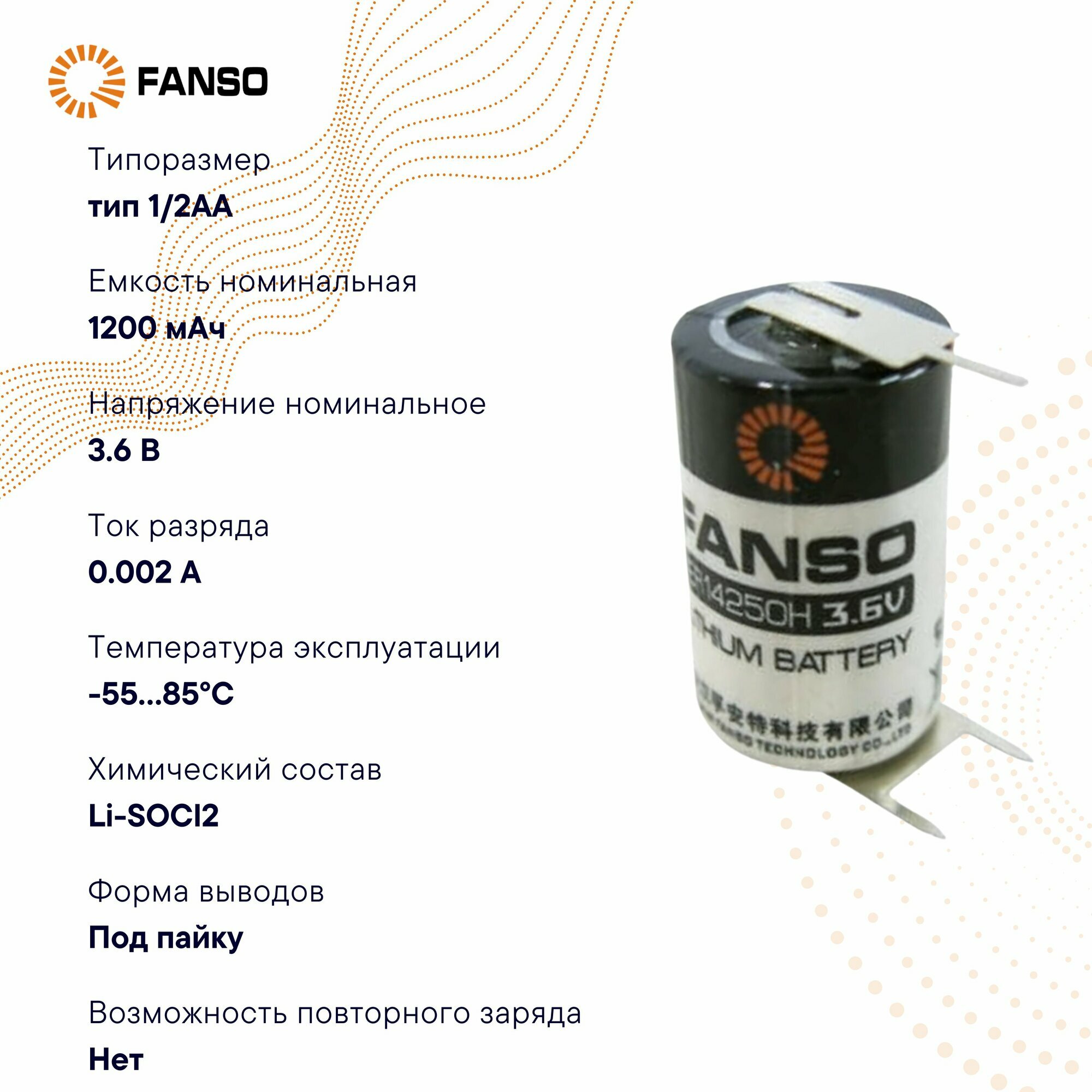 FANSO ER14250H/3PF Литиевая батарейка цилиндрическая для приборов, счетчиков, автомобилей и GPS, тип 1/2AA c тремя выводами под пайку, Li-SOCl2 информация: