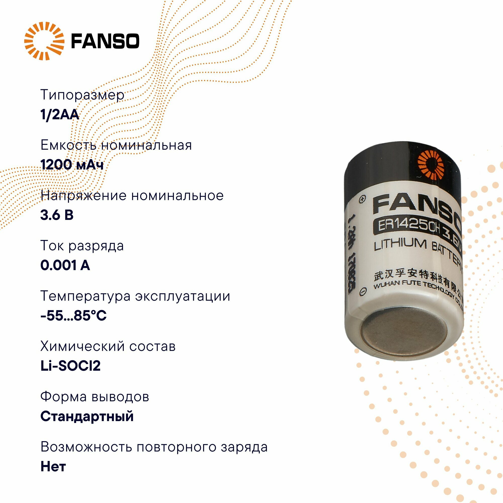 FANSO ER14250H/S Литиевая батарейка для автомобилей и датчиков 1/2AA, 1 шт. информация: