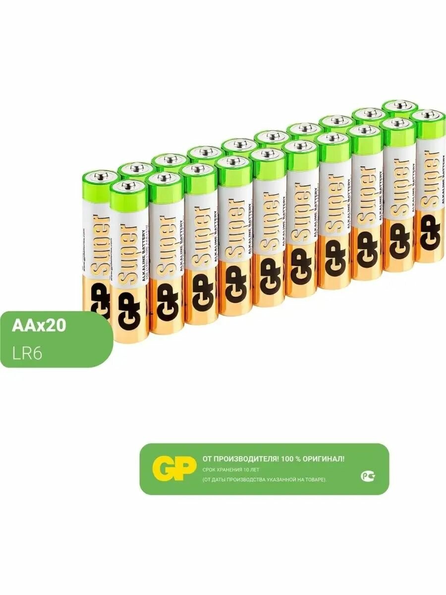 Батарейки алкалиновые 20 шт GP Super, AA (LR6, 15А) пальчиковые, 1 упаковка