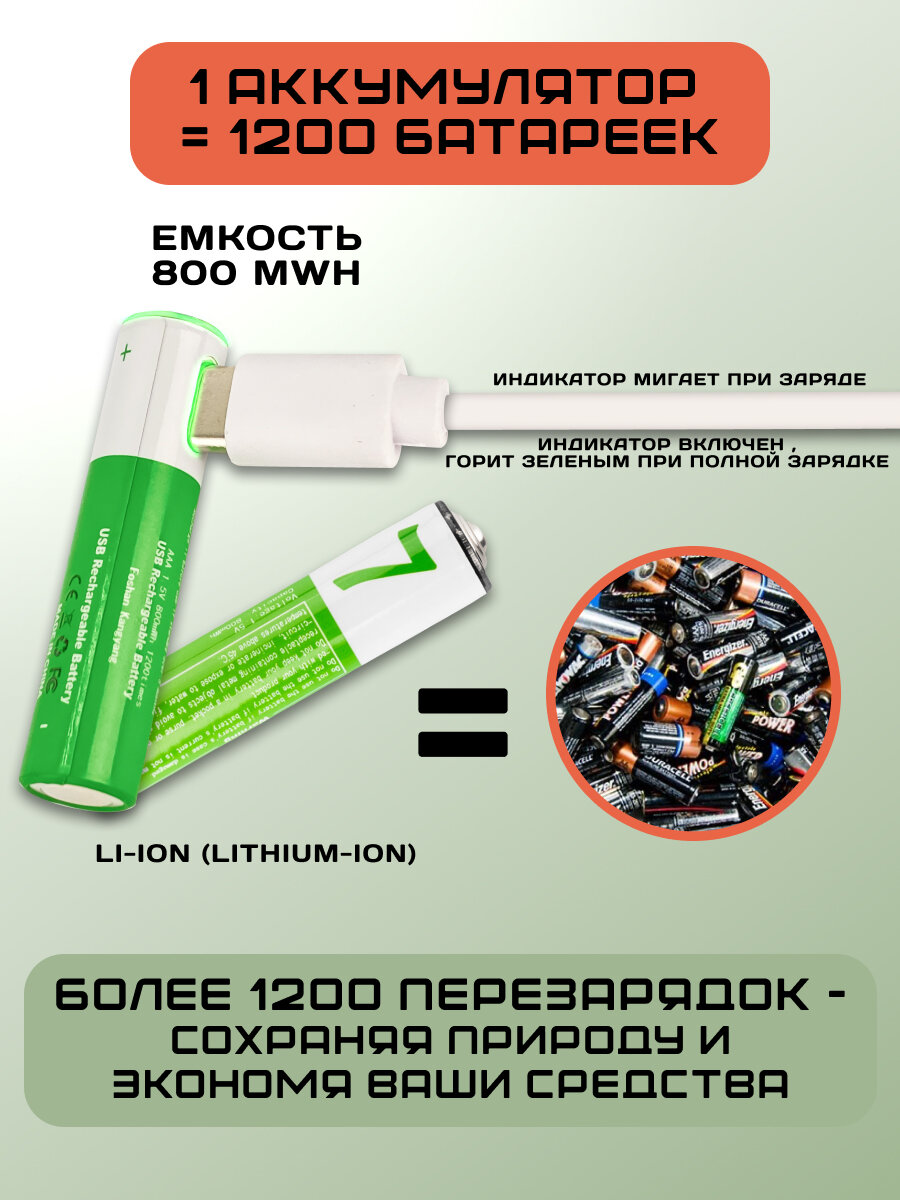 Батарейки перезаряжаемые AAA (Li-ion) Type-C (2 шт) + кабель Type-C информация:
