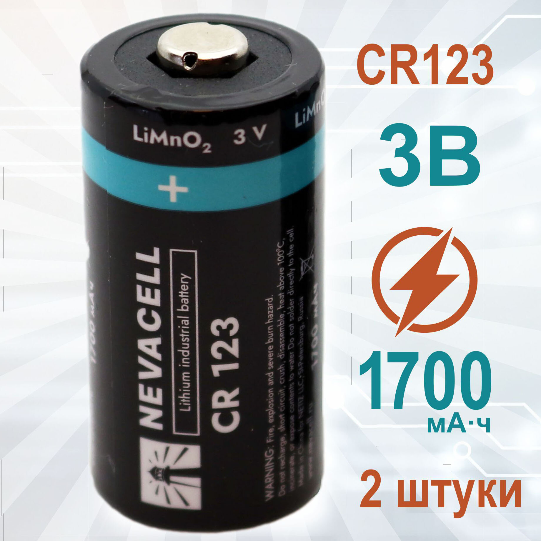 Батарейка NevaCell CR123A 1700мАч, 3В, литиевая, 2 штуки информация: