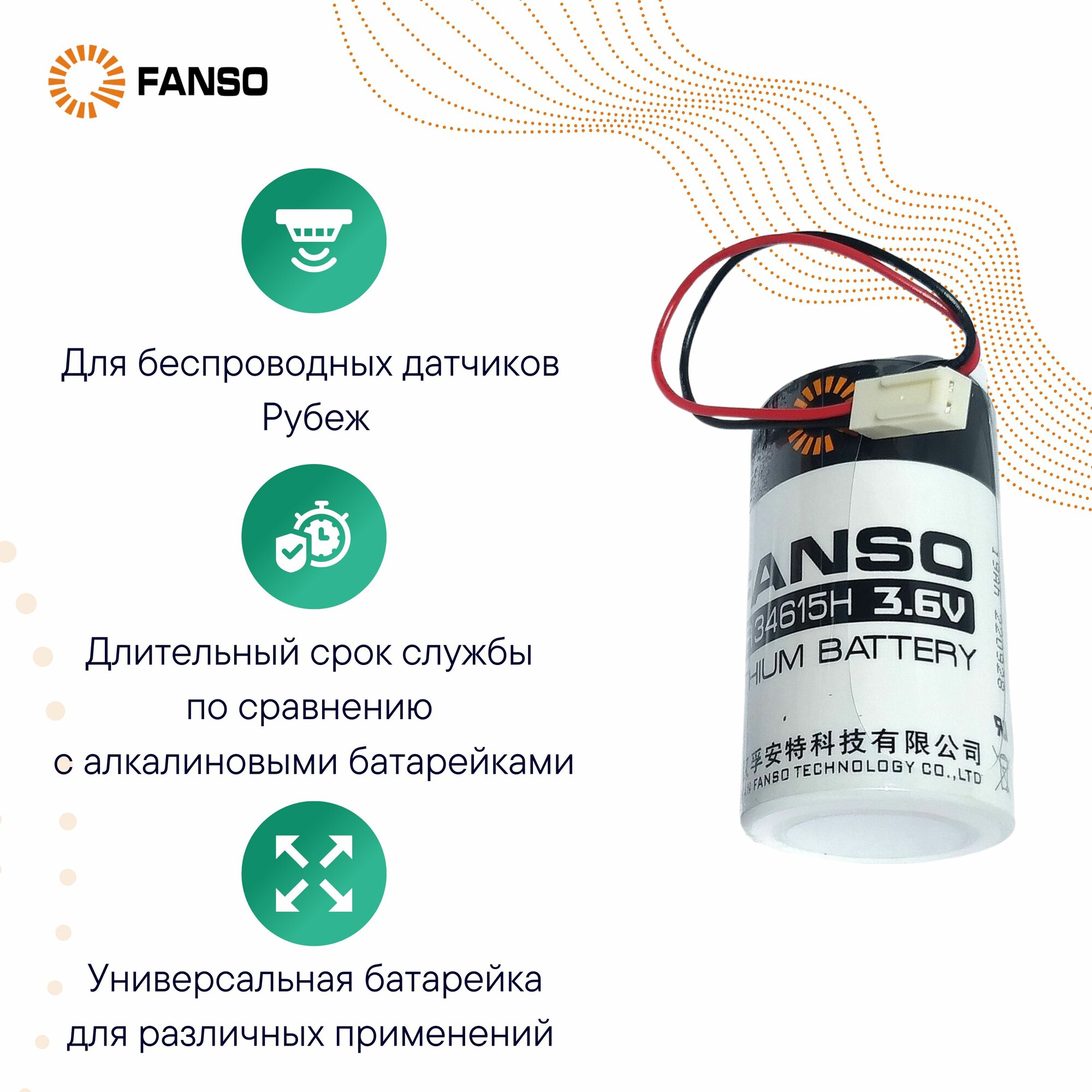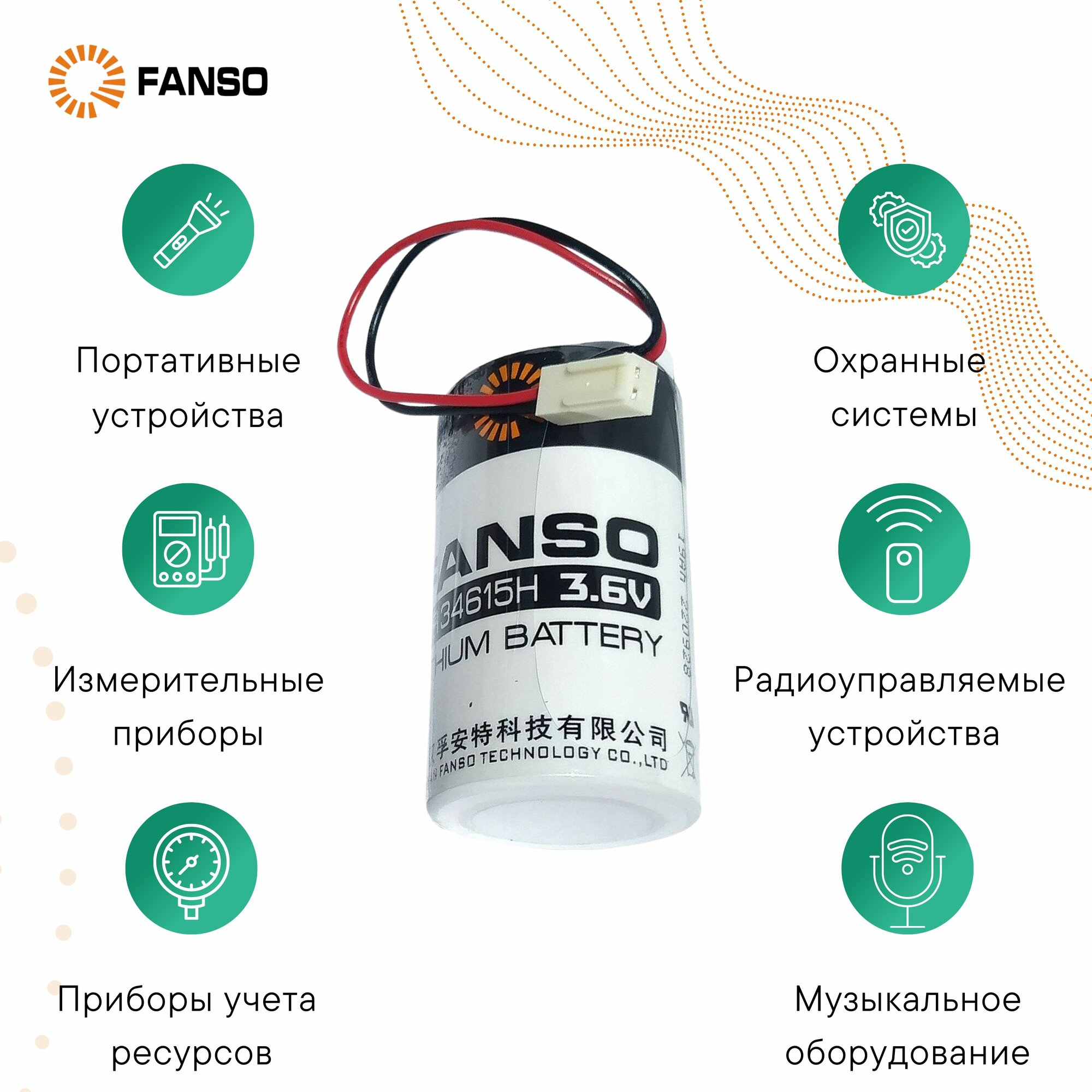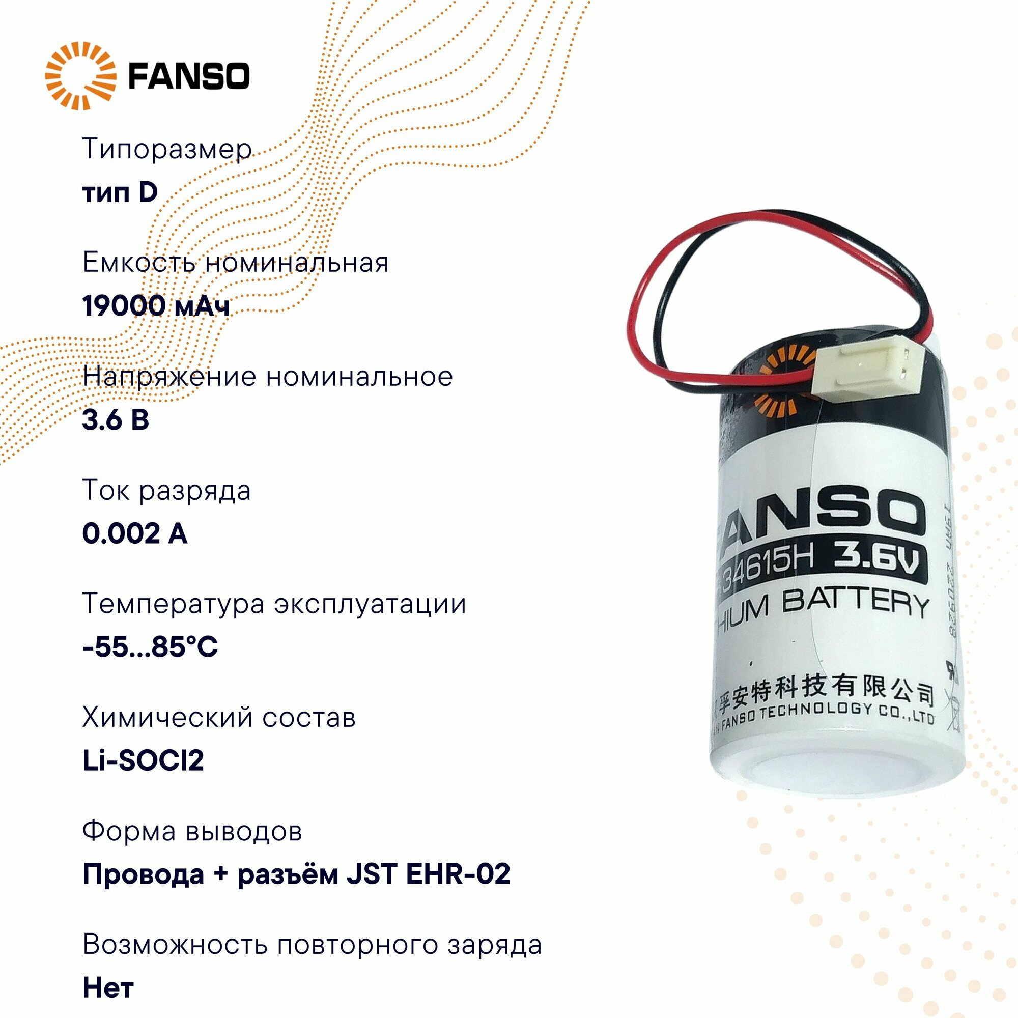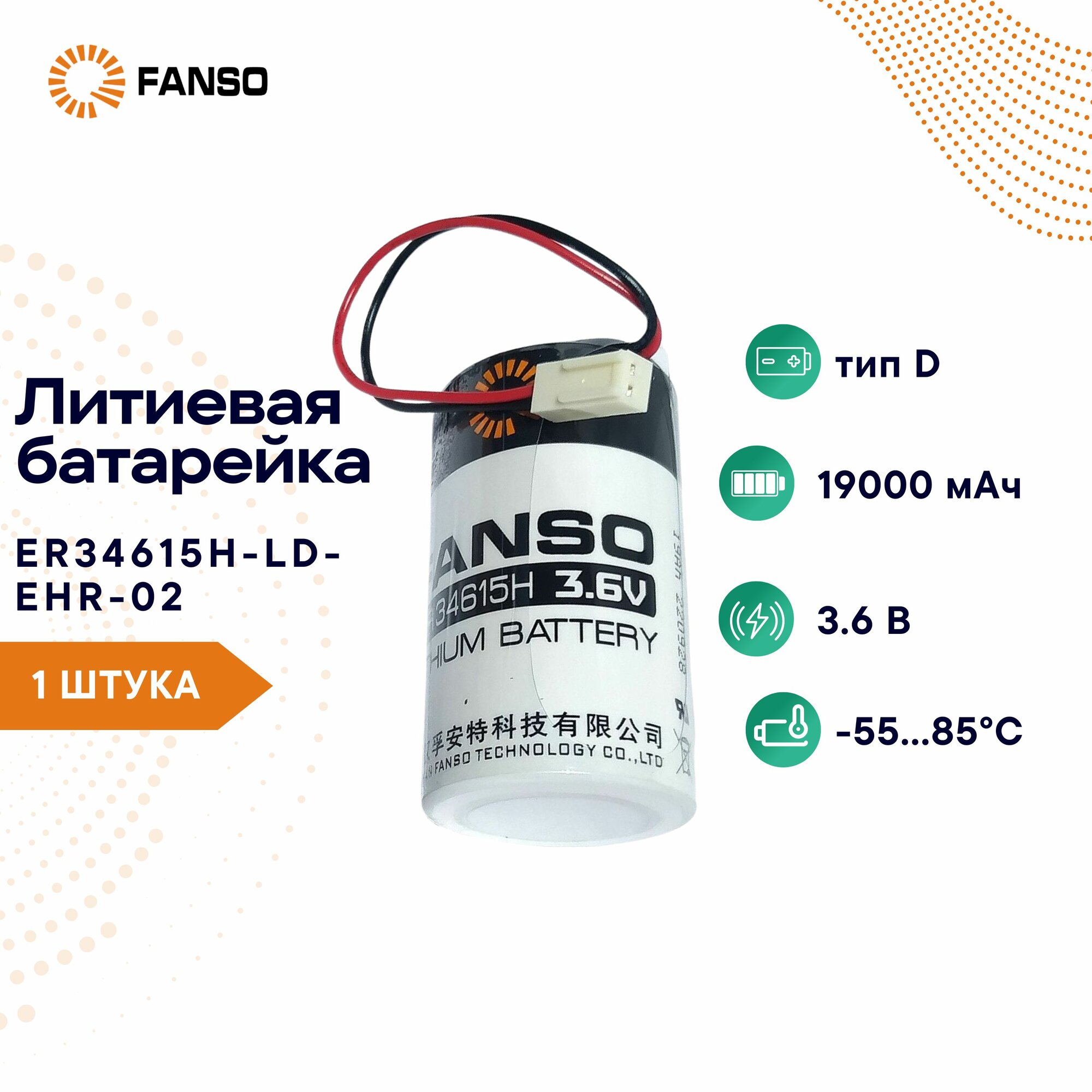 FANSO ER34615H-LD-EHR-02 Литиевая батарейка для приборов, счетчиков, автомобилей и GPS , тип D с проводами, Li-SOCl2 информация: