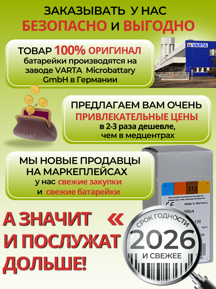 Батарейки 312 6 блистеров. Для слуховых аппаратов 1 950 ₽