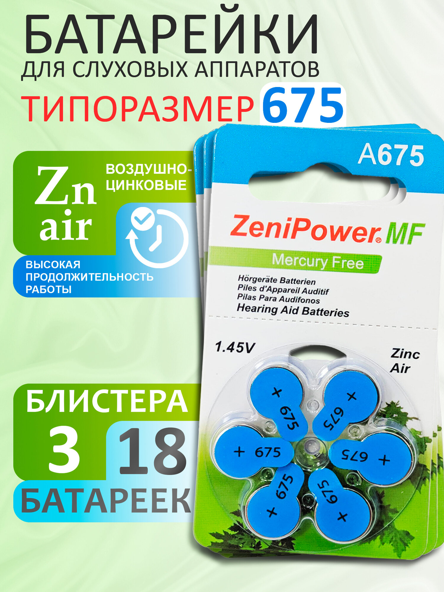 Батарейки для слухового аппарата ZeniPower 675, 3бл (18 шт.) информация: