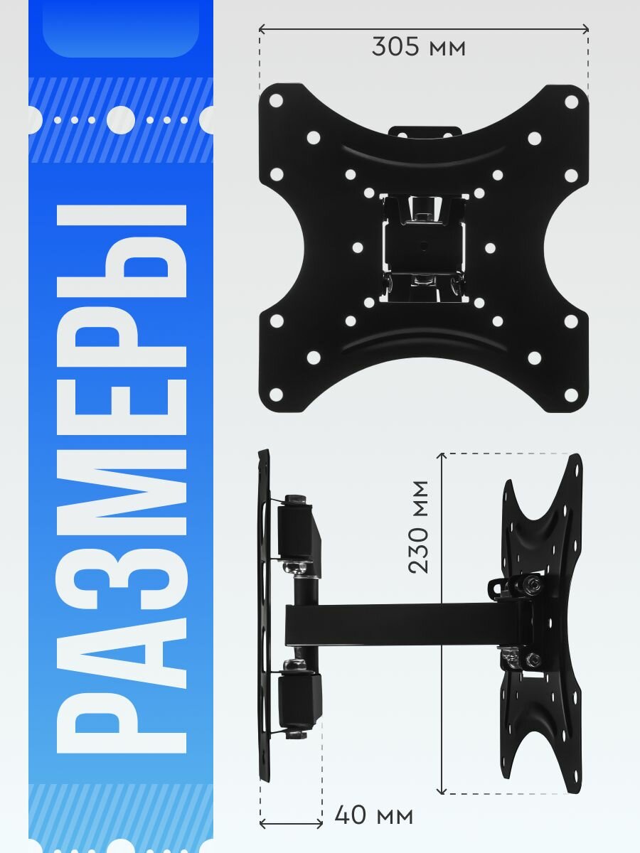 10 цен на Кронштейн для телевизора СТАРТ, до 65", до 30 кг, настенный, с 2 коленами, наклонно-поворотный, VESA 75/100/200/300/400