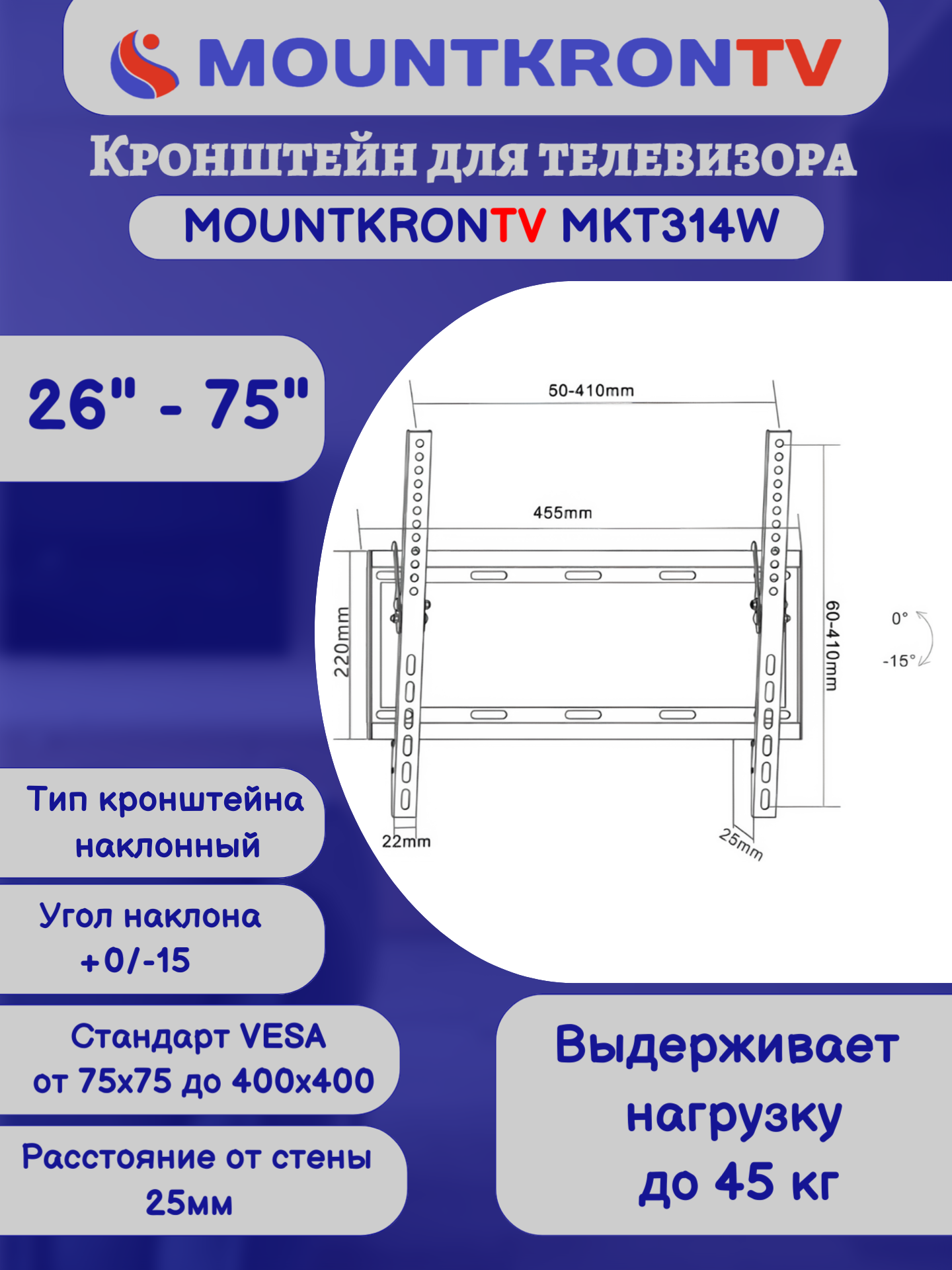 Кронштейн для телевизора MOUNTKRONTV MKT314W на стену, наклонный, диагональ 26"-75", белый информация: