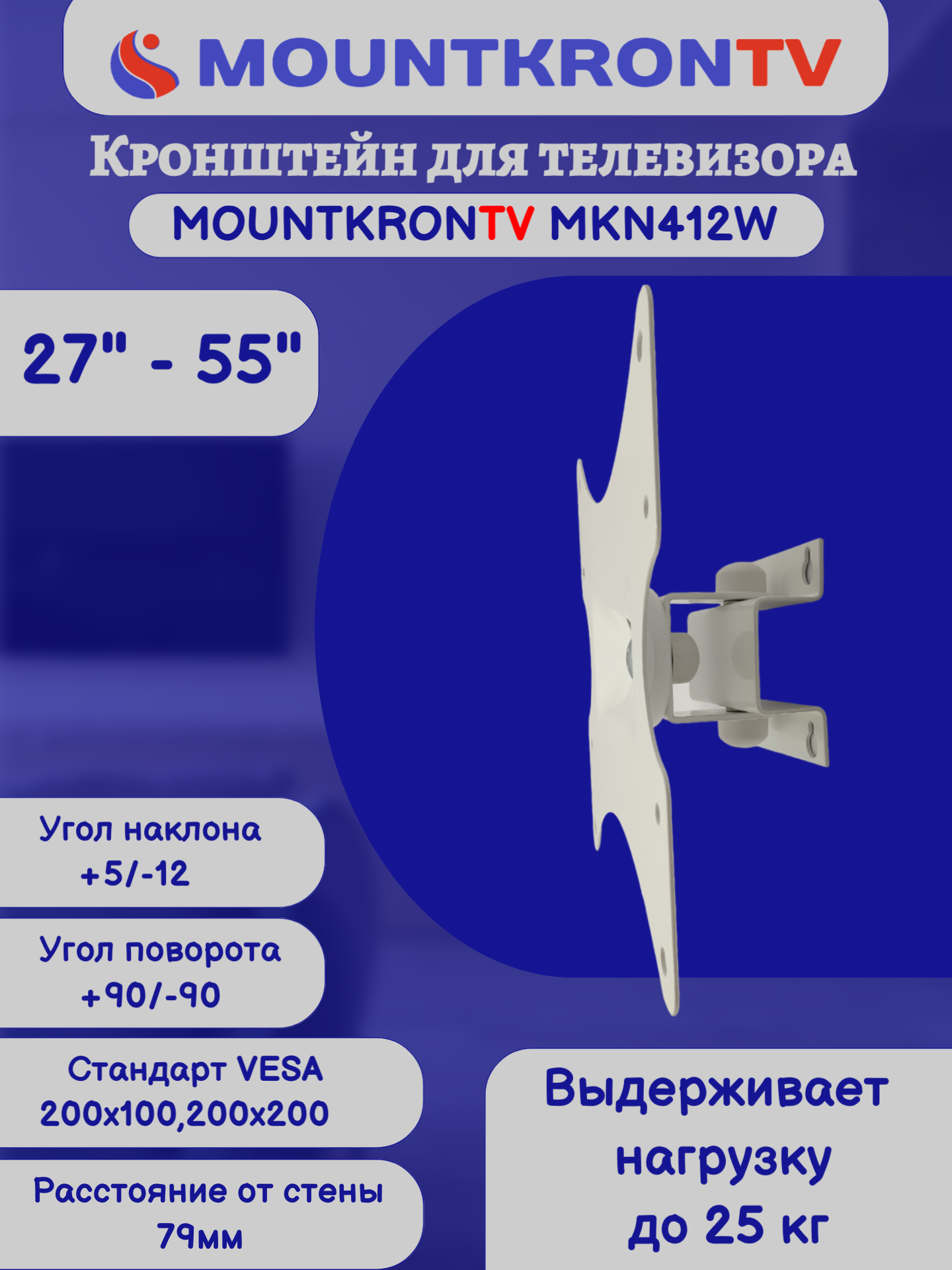 Кронштейн для телевизора MOUNTKRONTV MKN412W на стену, наклонно-поворотный, диагональ 27"-55", белый информация: