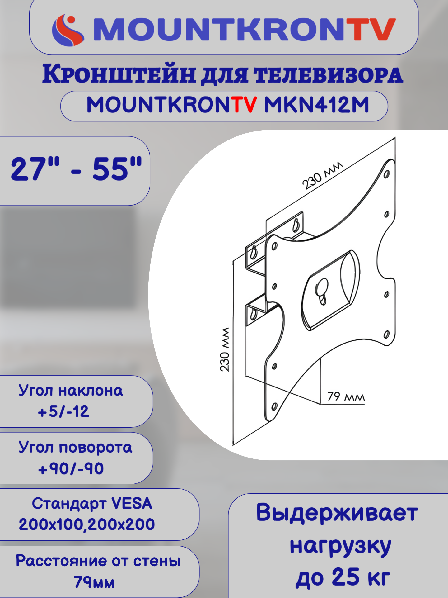 Кронштейн для телевизора MOUNTKRONTV MKN412M на стену, наклонно-поворотный, диагональ 27"-55", серый металлик информация: