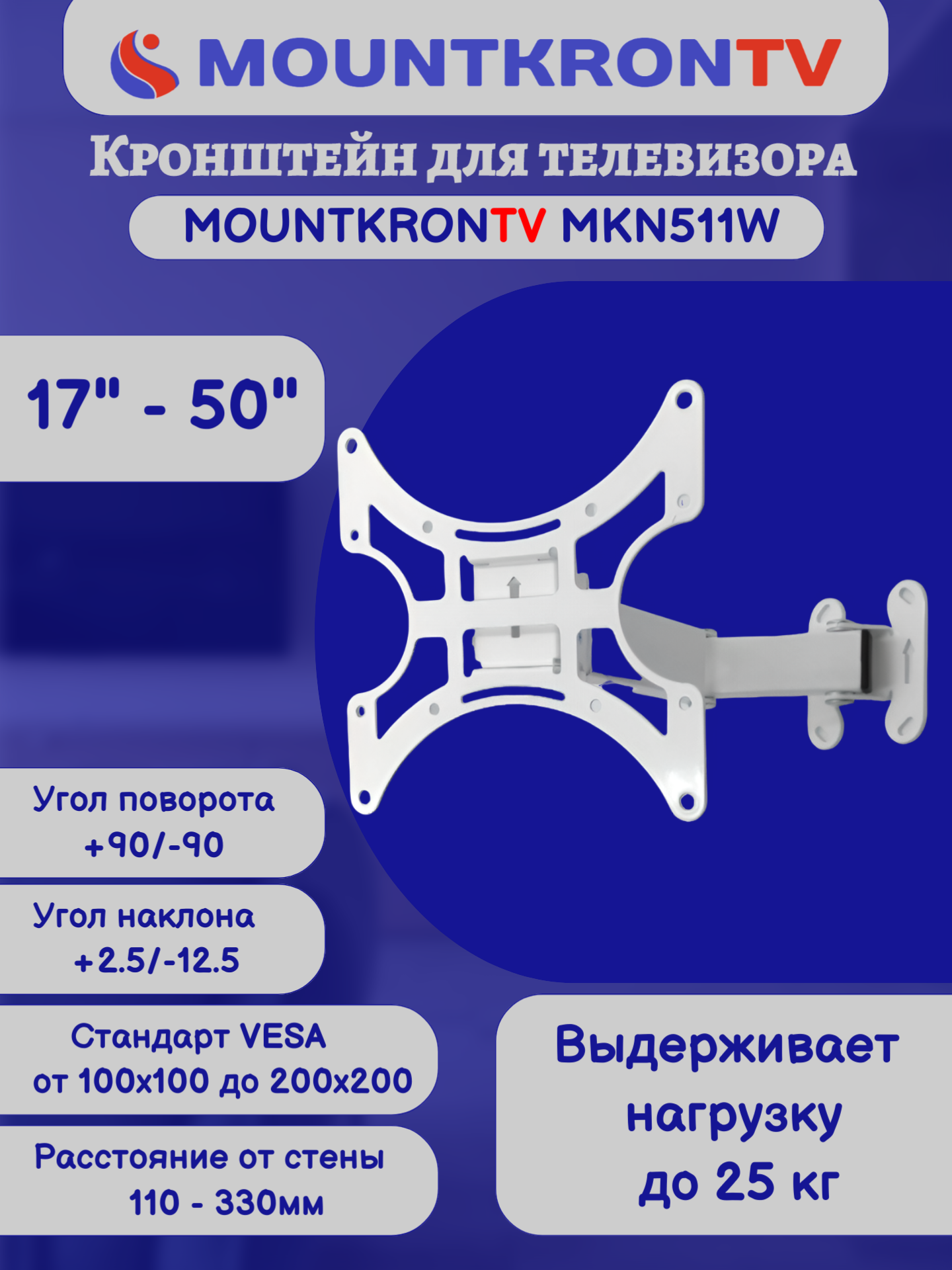 Кронштейн для телевизора MOUNTKRONTV MKN511W на стену, наклонно-поворотный, диагональ 17"-50, белый информация: