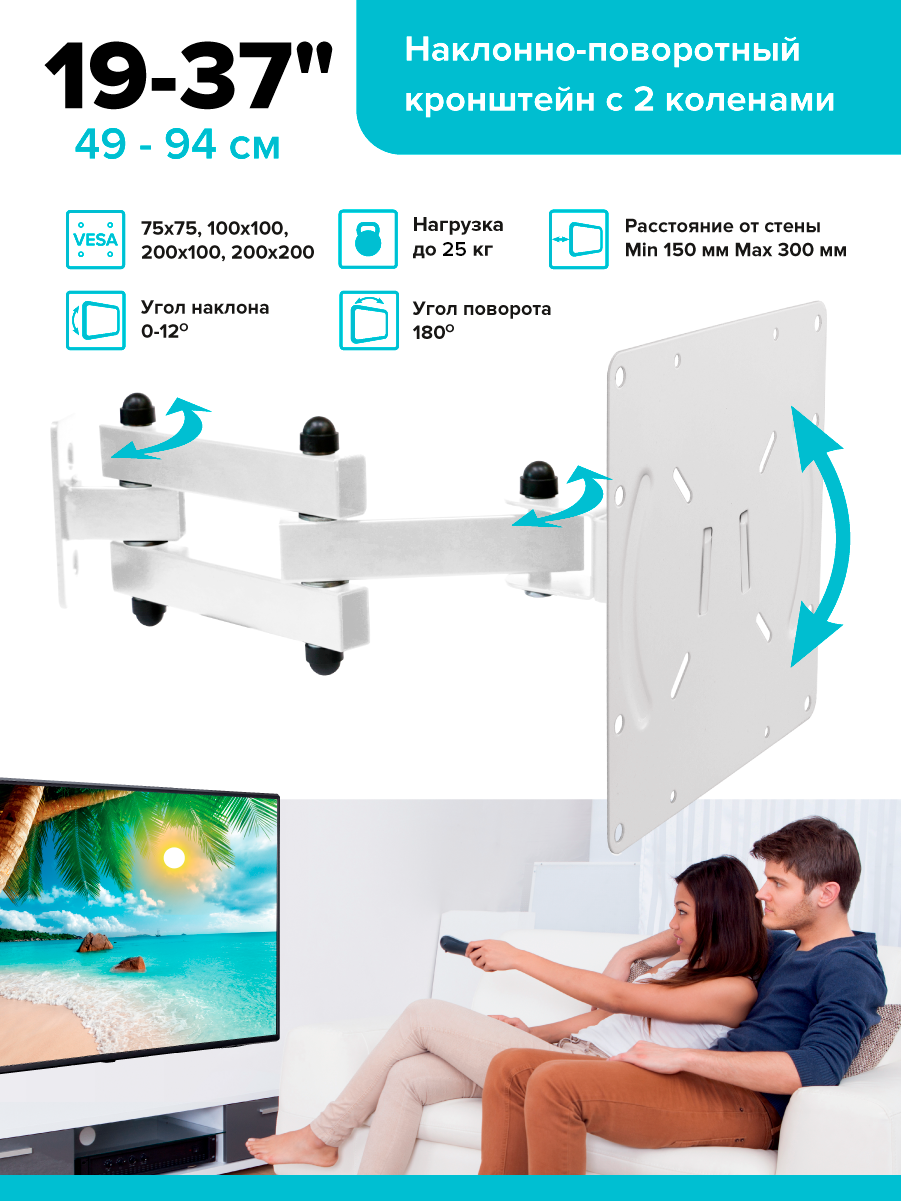 Кронштейн для ТВ Наклонно-поворотный с 2 коленами 25кг 19*37" белый/Absolute Comfort информация:
